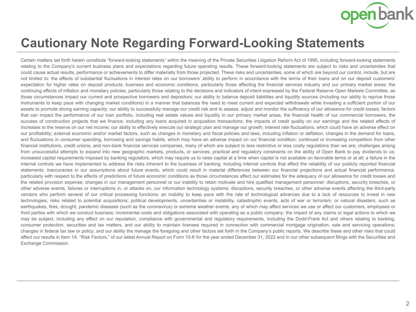 Certain matters set forth herein constitute “forward-looking statements” within the meaning of the Private Securities Litigation Reform Act of 1995, including forward-looking statements relating to the Company’s current business plans and expectations regarding future operating results. These forward-looking statements are subject to risks and uncertainties that could cause actual results, performance or achievements to differ materially from those projected. These risks and uncertainties, some of which are beyond our control, include, but are not limited to: the effects of substantial fluctuations in interest rates on our borrowers’ ability to perform in accordance with the terms of their loans and on our deposit customers’ expectation for higher rates on deposit products; business and economic conditions, particularly those affecting the financial services industry and our primary market areas; the continuing effects of inflation and monetary policies, particularly those relating to the decisions and indicators of intent expressed by the Federal Reserve Open Markets Committee, as those circumstances impact our current and prospective borrowers and depositors; our ability to balance deposit liabilities and liquidity sources (including our ability to reprice those instruments to keep pace with changing market conditions) in a manner that balances the need to meet current and expected withdrawals while investing a sufficient portion of our assets to promote strong earning capacity; our ability to successfully manage our credit risk and to assess, adjust and monitor the sufficiency of our allowance for credit losses; factors that can impact the performance of our loan portfolio, including real estate values and liquidity in our primary market areas, the financial health of our commercial borrowers, the success of construction projects that we finance, including any loans acquired in acquisition transactions; the impacts of credit quality on our earnings and the related effects of increases to the reserve on our net income; our ability to effectively execute our strategic plan and manage our growth; interest rate fluctuations, which could have an adverse effect on our profitability; external economic and/or market factors, such as changes in monetary and fiscal policies and laws, including inflation or deflation, changes in the demand for loans, and fluctuations in consumer spending, borrowing and savings habits, which may have an adverse impact on our financial condition; continued or increasing competition from other financial institutions, credit unions, and non-bank financial services companies, many of which are subject to less restrictive or less costly regulations than we are; challenges arising from unsuccessful attempts to expand into new geographic markets, products, or services; practical and regulatory constraints on the ability of Open Bank to pay dividends to us; increased capital requirements imposed by banking regulators, which may require us to raise capital at a time when capital is not available on favorable terms or at all; a failure in the internal controls we have implemented to address the risks inherent to the business of banking; including internal controls that affect the reliability of our publicly reported financial statements; inaccuracies in our assumptions about future events, which could result in material differences between our financial projections and actual financial performance, particularly with respect to the effects of predictions of future economic conditions as those circumstances affect our estimates for the adequacy of our allowance for credit losses and the related provision expense; changes in our management personnel or our inability to retain motivate and hire qualified management personnel; disruptions, security breaches, or other adverse events, failures or interruptions in, or attacks on, our information technology systems; disruptions, security breaches, or other adverse events affecting the third-party vendors who perform several of our critical processing functions; an inability to keep pace with the rate of technological advances due to a lack of resources to invest in new technologies; risks related to potential acquisitions; political developments, uncertainties or instability, catastrophic events, acts of war or terrorism, or natural disasters, such as earthquakes, fires, drought, pandemic diseases (such as the coronavirus) or extreme weather events, any of which may affect services we use or affect our customers, employees or third parties with which we conduct business; incremental costs and obligations associated with operating as a public company; the impact of any claims or legal actions to which we may be subject, including any effect on our reputation; compliance with governmental and regulatory requirements, including the Dodd-Frank Act and others relating to banking, consumer protection, securities and tax matters, and our ability to maintain licenses required in connection with commercial mortgage origination, sale and servicing operations; changes in federal tax law or policy; and our ability the manage the foregoing and other factors set forth in the Company’s public reports. We describe these and other risks that could affect our results in Item 1A. “Risk Factors,” of our latest Annual Report on Form 10-K for the year ended December 31, 2022 and in our other subsequent filings with the Securities and Exchange Commission. Cautionary Note Regarding Forward-Looking Statements 2