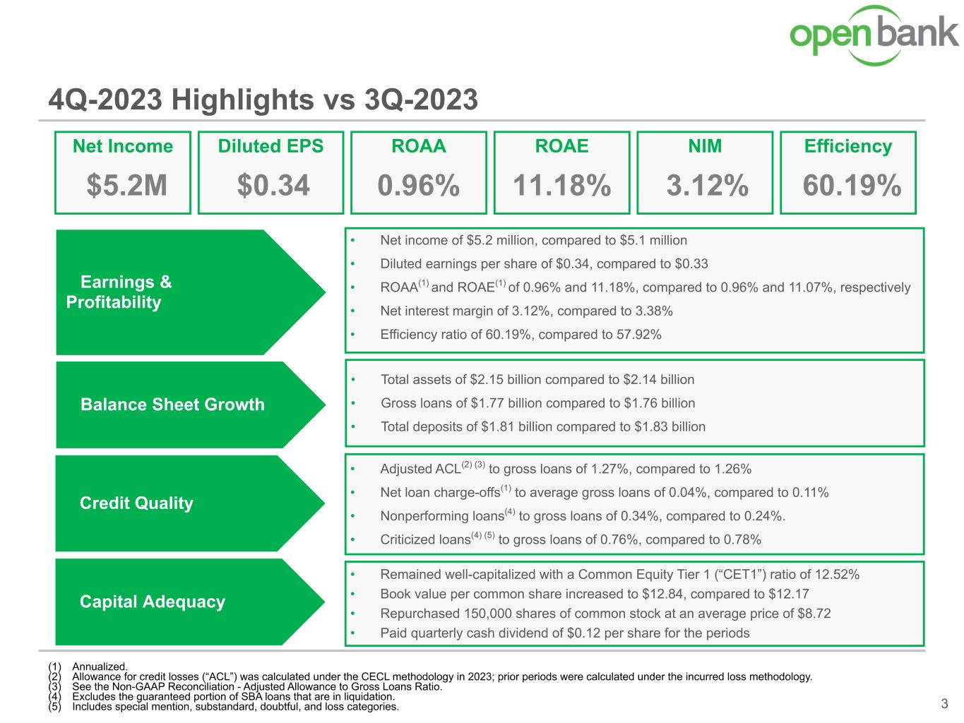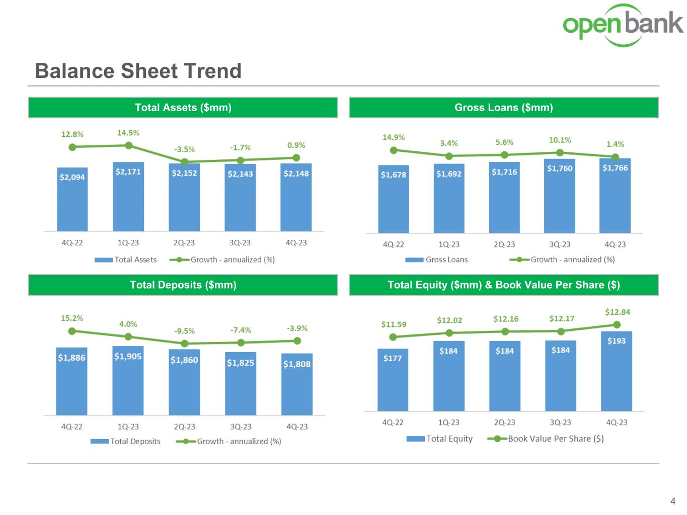 4Q-2023 Highlights vs 3Q-2023 3 (1) Annualized. (2) Allowance for credit losses (“ACL”) was calculated under the CECL methodology in 2023; prior periods were calculated under the incurred loss methodology. (3) See the Non-GAAP Reconciliation - Adjusted Allowance to Gross Loans Ratio. (4) Excludes the guaranteed portion of SBA loans that are in liquidation. (5) Includes special mention, substandard, doubtful, and loss categories. Net Income $5.2M Earnings & Profitability Balance Sheet Growth Credit Quality Capital Adequacy • Net income of $5.2 million, compared to $5.1 million • Diluted earnings per share of $0.34, compared to $0.33 • ROAA(1) and ROAE(1) of 0.96% and 11.18%, compared to 0.96% and 11.07%, respectively • Net interest margin of 3.12%, compared to 3.38% • Efficiency ratio of 60.19%, compared to 57.92% • Total assets of $2.15 billion compared to $2.14 billion • Gross loans of $1.77 billion compared to $1.76 billion • Total deposits of $1.81 billion compared to $1.83 billion • Adjusted ACL(2) (3) to gross loans of 1.27%, compared to 1.26% • Net loan charge-offs(1) to average gross loans of 0.04%, compared to 0.11% • Nonperforming loans(4) to gross loans of 0.34%, compared to 0.24%. • Criticized loans(4) (5) to gross loans of 0.76%, compared to 0.78% • Remained well-capitalized with a Common Equity Tier 1 (“CET1”) ratio of 12.52% • Book value per common share increased to $12.84, compared to $12.17 • Repurchased 150,000 shares of common stock at an average price of $8.72 • Paid quarterly cash dividend of $0.12 per share for the periods Diluted EPS $0.34 ROAA 0.96% ROAE 11.18% NIM 3.12% Efficiency 60.19%