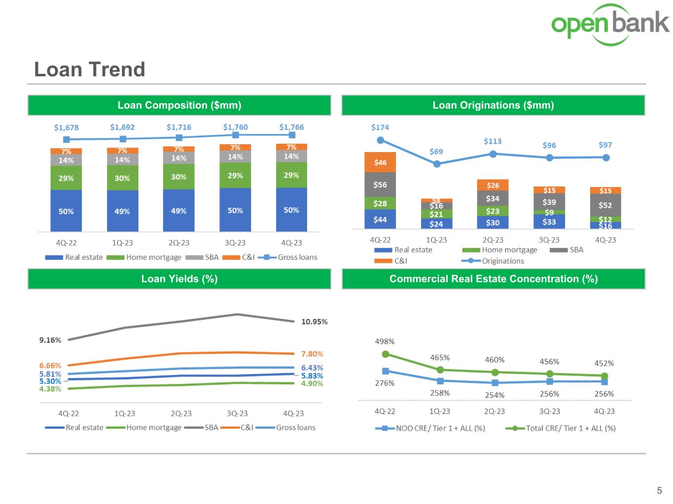 Loan Trend 5 Loan Originations ($mm)Loan Composition ($mm) Loan Yields (%) Commercial Real Estate Concentration (%)