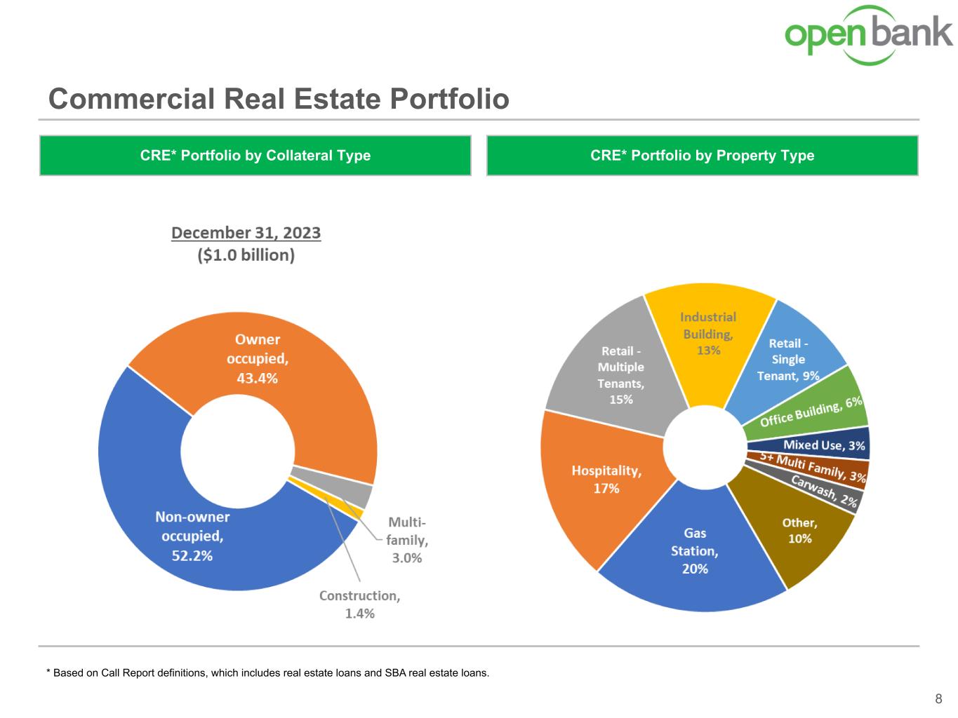 * Based on Call Report definitions, which includes real estate loans and SBA real estate loans. Commercial Real Estate Portfolio 8 CRE* Portfolio by Property TypeCRE* Portfolio by Collateral Type
