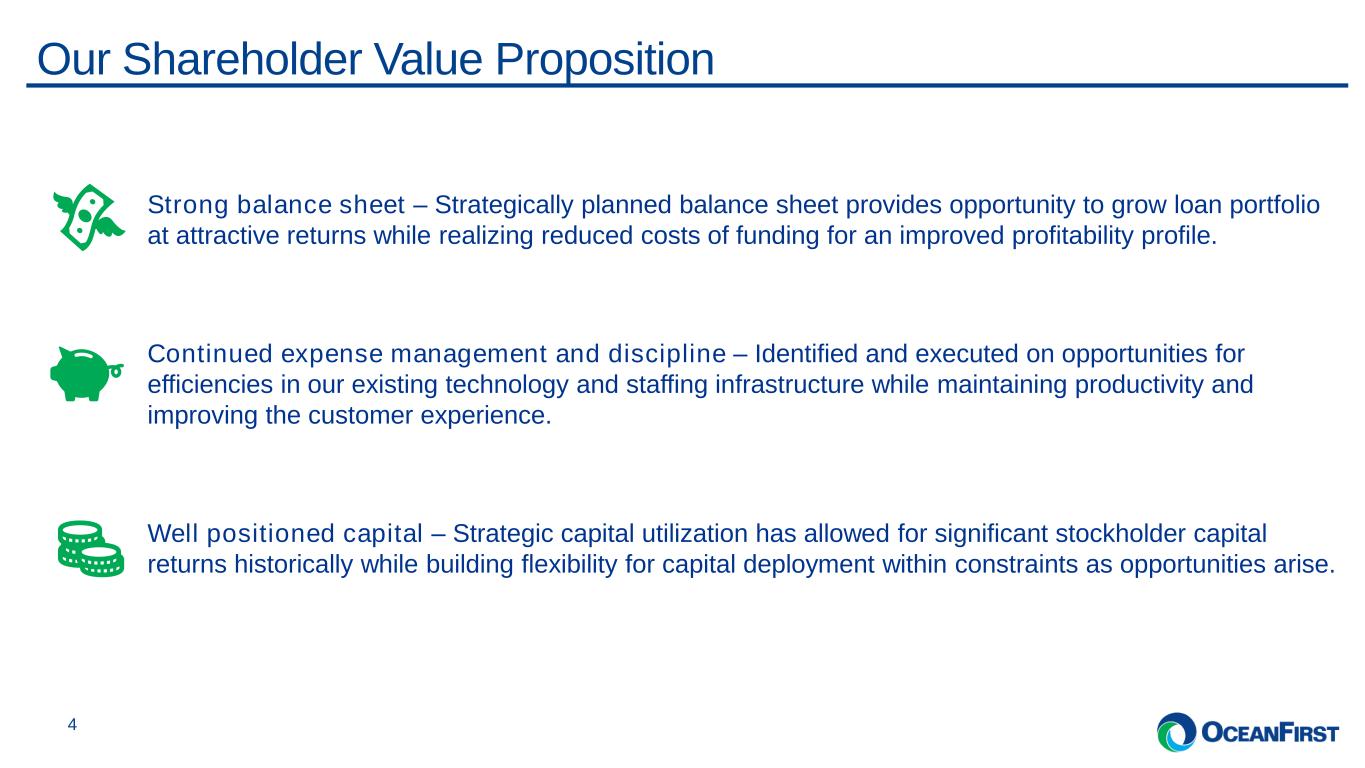. . .Overview of OceanFirst 3 Tailored Footprint Across Key Markets Corporate Overview & Market Data Ticker OCFC (NASDAQ) HQ Red Bank, NJ Branch Network 39 branches and 6 commercial banking centers Core Markets New Jersey, New York City, Greater Philadelphia Expansion Markets Boston and Baltimore Balance Sheet and Capital (Q1-23) Assets $13.5 billion Net Loans $10.1 billion Deposits $10.4 billion Non-performing Loans / Loans1 0.26% Tang. Equity / Tang. Assets2 8.8% CET1 Ratio (est.) 10.9% Q4-23 Loan Portfolio ($’millions) Q4-23 Deposit Base ($’millions) Core Profitability (Q1-23)2 Net Income $26.3 million EPS $0.45 Net Interest Margin (%)3 2.77% Efficiency Ratio (%) 60.0% ROAA (%) 0.77% ROTCE (%) 9.7% Corporate Overview and Market Data Balance Sheet and C it l (Q4-23) Core Profitability ( 4-23)2 Commercial Banking Centers Retail Branches $5,354 CRE Investor Owned $944 CRE Owner Occupied $666 C&I $2,980 Residential $251 Home Eq. & Consumer $1,657 Non-interest Bearing $3,912 Interest-bearing Checking $1,022 Money Market $1,399 Savings $2,445 Time Deposits Note: All data presented is as of December 31, 2023. (1) PCD loans are not included in these metrics. (2) For non-GAAP financial measures, please refer to the ‘Non-GAAP Reconciliations’ in the Appendices for a reconciliation to GAAP financial information. (3) Core NIM excludes purchase accounting and prepayment fee income. Refer to the Earnings Release for additional information.