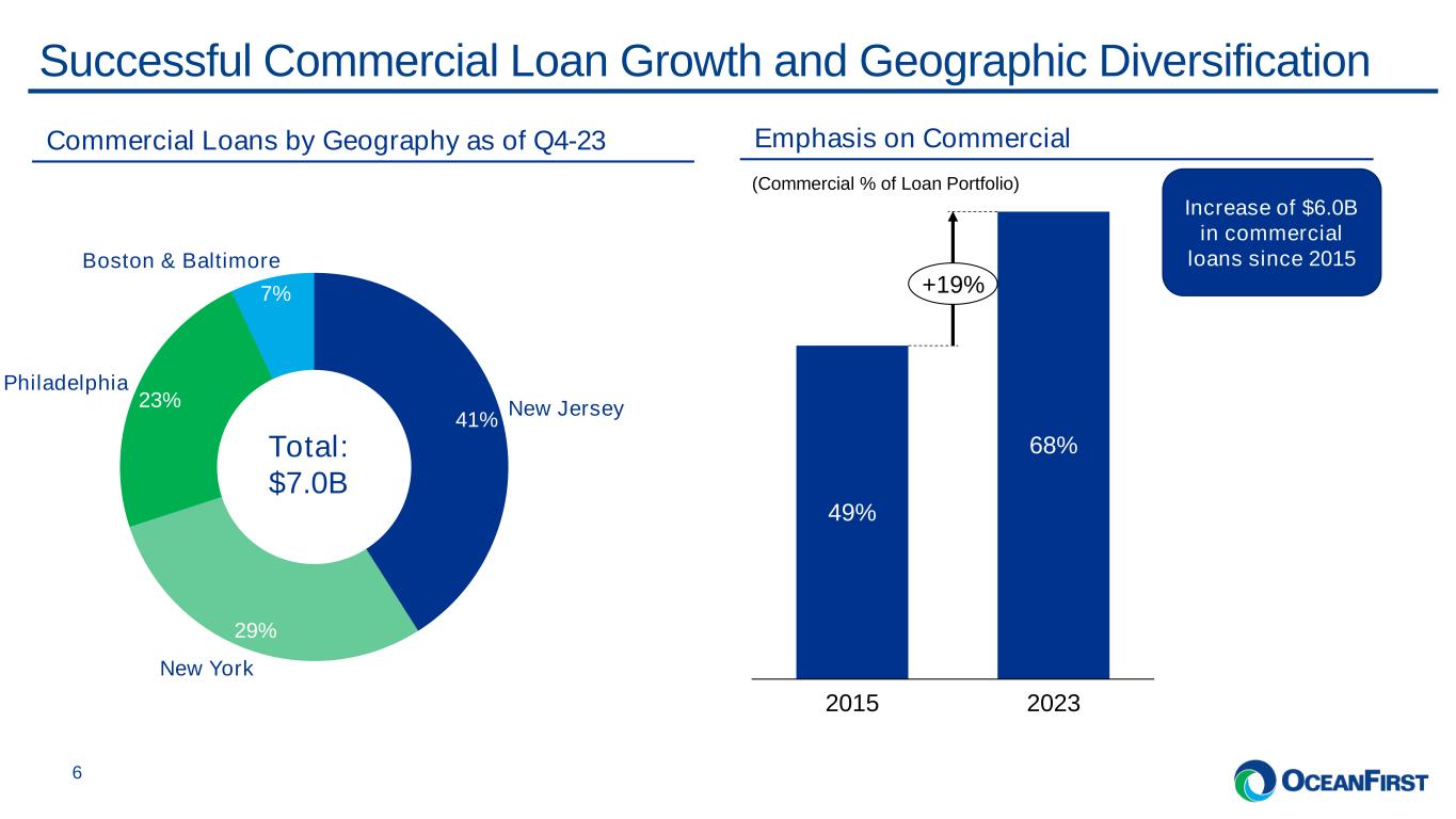 . . .Proven Historical Net Interest Income and Loan Growth 5 76,829 120,262 169,218 240,502 255,971 312,951 305,338 377,477 369,731 3.25% 2015 3.46% 2016 3.52% 2017 3.71% 2018 3.62% 2019 3.16% 2020 2.93% 2021 3.37% 2022 3.02% 2023 Net Interest Margin Net Interest Income Peer Leading Net Interest Income Growth ($’000) Net Interest Income CAGR 22% 1,135 1,187 2,023 2,296 3,492 4,378 5,172 5,354 687 758 1,046 1,189 1,616 1,504 1,620 1,610 831 1,704 1,749 2,045 2,321 2,309 2,480 2,862 2,980 193 453 511 2015 291 2016 281 2017 475 2018 408 2019 339 2020 261 2021 264 2022 251 2023 1,988 3,817 3,975 5,589 6,214 7,756 8,623 9,918 10,195 Home Equity & Consumer Residential Owner Occupied CRE & C&I Investor CRE Significant Growth in Commercial Loan Portfolio ($’millions) Investor CRE CAGR 34% Owner Occupied CRE / C&I CAGR 17%
