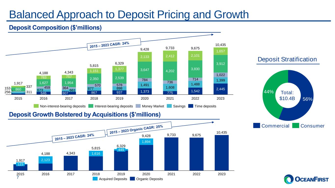. . .Successful Commercial Loan Growth and Geographic Diversification 6 49% 68% 2015 2023 +19% (Commercial % of Loan Portfolio) Commercial Loans by Geography as of Q4-23 Emphasis on Commercial Increase of $6.0B in commercial loans since 2015 41% 29% 23% 7% New Jersey New York Philadelphia Boston & Baltimore Total: $7.0B