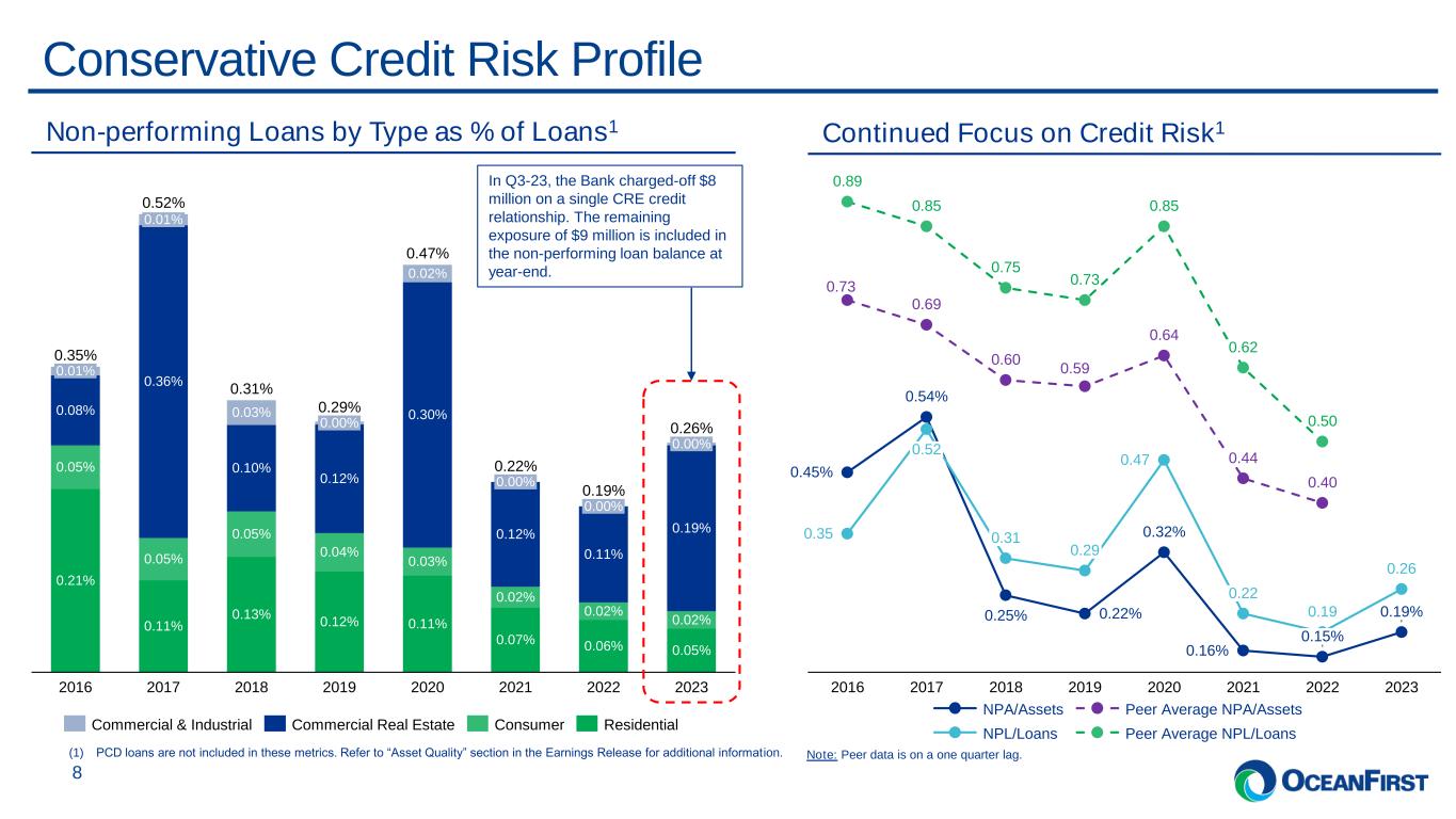 . . .Balanced Approach to Deposit Pricing and Growth 7 Deposit Composition ($’millions) 256 646 867 937 1,373 775 1,542 2,445 311 673 661 877 898 1,491 1,608 1,488 1,399 153 784 736 714 1,022 860 1,627 1,954 2,350 2,539 3,647 4,202 3,830 3,912 337 783 757 1,151 1,377 2,133 2,412 2,101 1,657 2015 459 2016 364 607 2017 570 2018 578 2019 2020 2021 2022 2023 1,917 4,188 4,343 5,815 6,329 9,428 9,733 9,675 10,435 Non-interest-bearing deposits Interest-bearing deposits Money Market Savings Time deposits Deposit Growth Bolstered by Acquisitions ($’millions) 4,343 9,733 9,675 10,435 2,123 1,616 1,894 123 2015 2016 2017 2018 449 2019 2020 2021 2022 2023 1,917 4,188 5,815 6,329 9,428 Acquired Deposits Organic Deposits 56% 44% Commercial Consumer Total: $10.4B Deposit Stratification