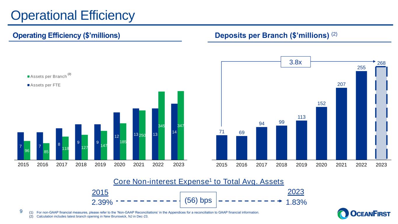 . . .Conservative Credit Risk Profile 8 0.08% 0.05% 0.21% 2016 0.01% 0.36% 0.05% 0.11% 2017 0.03% 0.10% 0.05% 0.13% 2018 0.00% 0.12% 0.04% 0.12% 2019 0.02% 0.30% 0.03% 0.11% 2020 0.00% 0.12% 0.02% 0.07% 2021 0.00% 0.11% 0.02% 0.06% 2022 0.00% 0.01% 0.02% 0.05% 2023 0.35% 0.52% 0.19% 0.29% 0.47% 0.22% 0.19% 0.26% 0.31% Commercial & Industrial Commercial Real Estate Consumer Residential (1) PCD loans are not included in these metrics. Refer to “Asset Quality” section in the Earnings Release for additional information. 0.54% 0.52 0.69 0.85 2017 0.25% 0.31 0.60 0.75 0.64 0.85 2020 0.16% 0.22 0.44 0.62 2021 0.15% 0.45% 0.19 0.40 0.50 2022 0.32%0.35 0.26 2023 0.73 0.89 2016 0.47 2019 0.73 0.59 0.29 0.22% 2018 0.19% NPA/Assets NPL/Loans Peer Average NPA/Assets Peer Average NPL/Loans Continued Focus on Credit Risk1Non-performing Loans by Type as % of Loans1 Note: Peer data is on a one quarter lag. In Q3-23, the Bank charged-off $8 million on a single CRE credit relationship. The remaining exposure of $9 million is included in the non-performing loan balance at year-end.