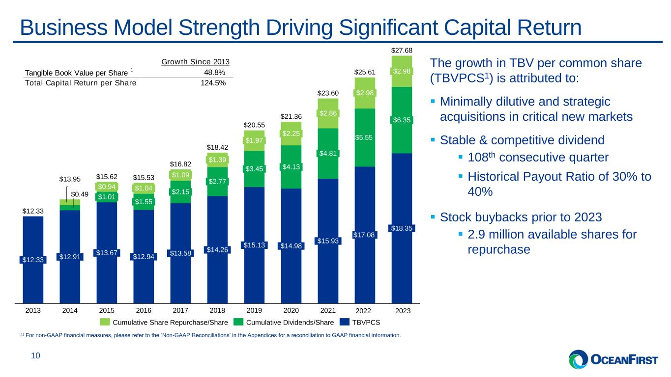 . . . 96 85 118 127 147 185 250 345 347 7 7 8 9 9 12 13 13 14 0 2 4 6 8 10 12 14 16 18 20 0 50 100 150 200 250 300 350 400 2015 2016 2017 2018 2019 2020 2021 2022 2023 Assets per Branch Assets per FTE Operational Efficiency 9 Deposits per Branch ($’millions) (2) (56) bps2.39% 1.83% 2015 2023 Core Non-interest Expense1 to Total Avg. Assets 71 69 94 99 113 152 207 255 268 2015 2016 2017 2018 2019 2020 2021 2022 2023 3.8x Operating Efficiency ($’millions) 20 20 2 2 2 2 2 2 23 (1) For non-GAAP financial measures, please refer to the ‘Non-GAAP Reconciliations’ in the Appendices for a reconciliation to GAAP financial information. (2) Calculation includes latest branch opening in New Brunswick, NJ in Dec-23. (2)