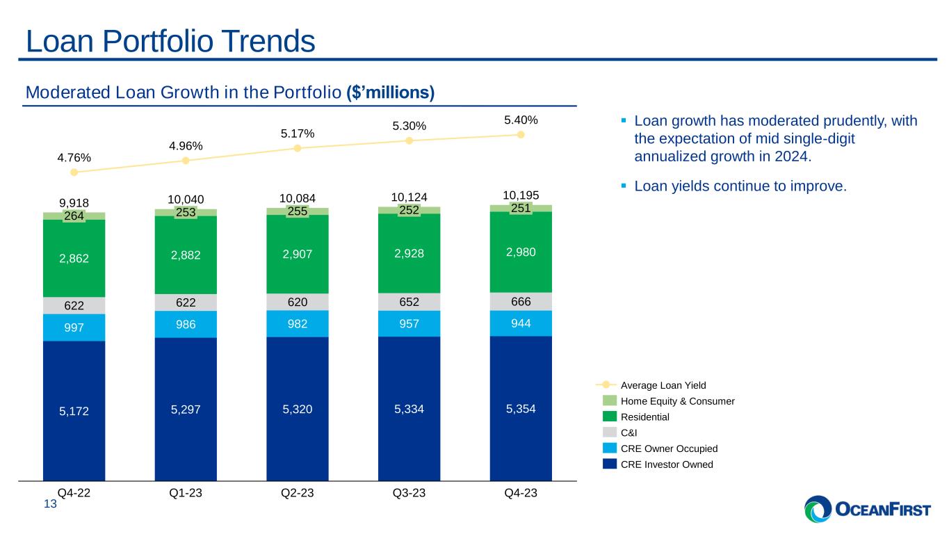. . .Q4-23 Financial Highlights 12 (1) For non-GAAP financial measures, please refer to the ‘Non-GAAP Reconciliations’ in the Appendices for a reconciliation to GAAP financial information. (2) Estimated. Financial Highlights $0.45 Core Diluted EPS 1 $88 million Net Interest Income 0.77% Core ROAA 1 9.67% Core ROTCE 1 $0.65 Core PTPP Diluted EPS 1 10.9% CET1 Ratio 2 ▪ Total deposits, excluding time deposits, increased by 1% from prior linked quarter. Net deposit growth funded a reduction in brokered time deposits of $364 million. ▪ In line with Management expense guidance, core non-interest expense(1) decreased to $58.5 million, representing a $6 million (or 9%) drop from the linked quarter. Core non-interest expense to total average assets1 declined to 1.7%, a 17 bps decline from the linked quarter. ▪ Capital remains strong and above “well capitalized” levels.
