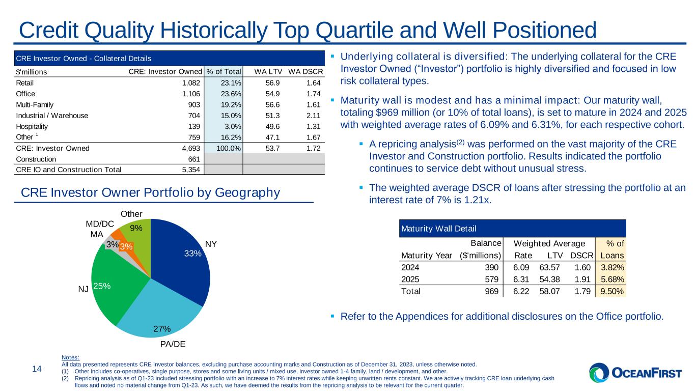 . . .Loan Portfolio Trends 13 Moderated Loan Growth in the Portfolio ($’millions) ▪ Loan growth has moderated prudently, with the expectation of mid single-digit annualized growth in 2024. ▪ Loan yields continue to improve. 5,172 5,297 5,320 5,334 5,354 997 986 982 957 944 622 622 620 652 666 2,862 2,882 2,907 2,928 2,980 4.76% 264 Q4-22 4.96% 253 Q1-23 5.17% 255 Q2-23 5.30% 252 Q3-23 5.40% 251 Q4-23 9,918 10,040 10,084 10,124 10,195 Average Loan Yield Home Equity & Consumer Residential C&I CRE Owner Occupied CRE Investor Owned