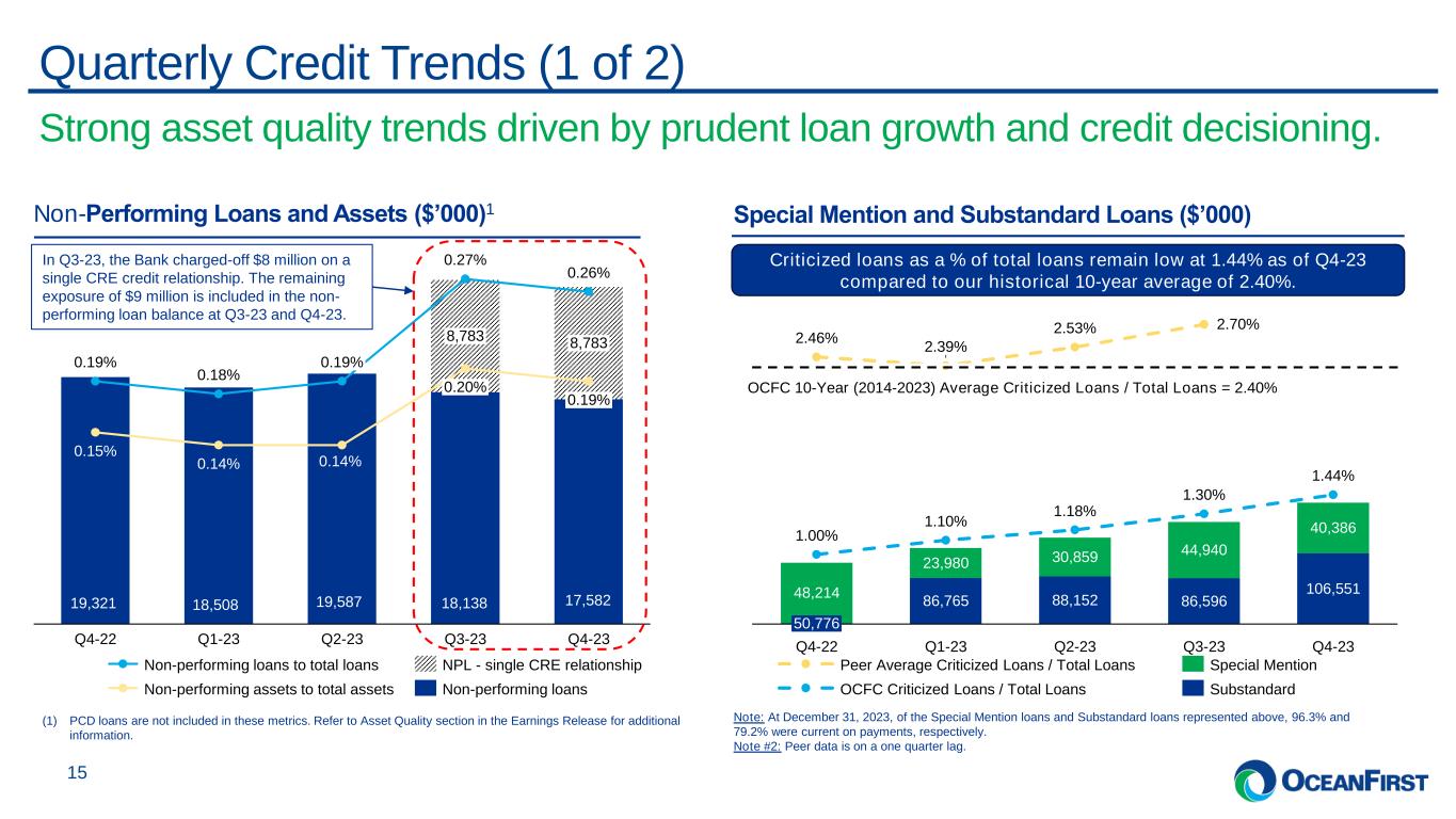 . . .Credit Quality Historically Top Quartile and Well Positioned ▪ Underlying collateral is diversified: The underlying collateral for the CRE Investor Owned (“Investor”) portfolio is highly diversified and focused in low risk collateral types. ▪ Maturity wall is modest and has a minimal impact: Our maturity wall, totaling $969 million (or 10% of total loans), is set to mature in 2024 and 2025 with weighted average rates of 6.09% and 6.31%, for each respective cohort. ▪ A repricing analysis(2) was performed on the vast majority of the CRE Investor and Construction portfolio. Results indicated the portfolio continues to service debt without unusual stress. ▪ The weighted average DSCR of loans after stressing the portfolio at an interest rate of 7% is 1.21x. ▪ Refer to the Appendices for additional disclosures on the Office portfolio. 14 CRE Investor Owner Portfolio by Geography Notes: All data presented represents CRE Investor balances, excluding purchase accounting marks and Construction as of December 31, 2023, unless otherwise noted. (1) Other includes co-operatives, single purpose, stores and some living units / mixed use, investor owned 1-4 family, land / development, and other. (2) Repricing analysis as of Q1-23 included stressing portfolio with an increase to 7% interest rates while keeping unwritten rents constant. We are actively tracking CRE loan underlying cash flows and noted no material change from Q1-23. As such, we have deemed the results from the repricing analysis to be relevant for the current quarter. Maturity Wall Detail Balance Weighted Average % of Maturity Year ($'millions) Rate LTV DSCR Loans 2024 390 6.09 63.57 1.60 3.82% 2025 579 6.31 54.38 1.91 5.68% Total 969 6.22 58.07 1.79 9.50% 33% 27% 25% 9% NY PA/DE NJ 3% MA 3% MD/DC Other CRE Investor Owned - Collateral Details $'millions CRE: Investor Owned % of Total WA LTV WA DSCR Retail 1,082 23.1% 56.9 1.64 Office 1,106 23.6% 54.9 1.74 Multi-Family 903 19.2% 56.6 1.61 Industrial / Warehouse 704 15.0% 51.3 2.11 Hospitality 139 3.0% 49.6 1.31 Other 1 759 16.2% 47.1 1.67 CRE: Investor Owned 4,693 100.0% 53.7 1.72 Construction 661 CRE IO and Construction Total 5,354