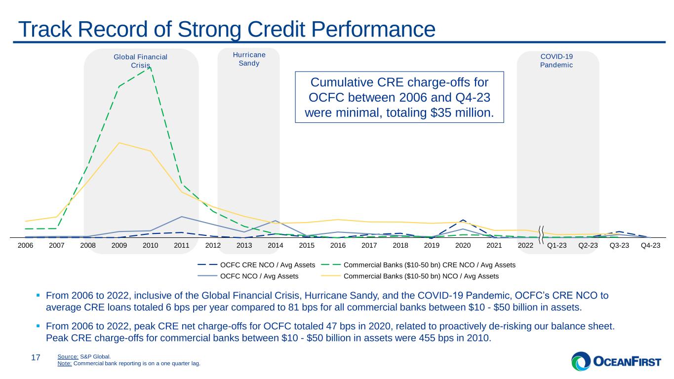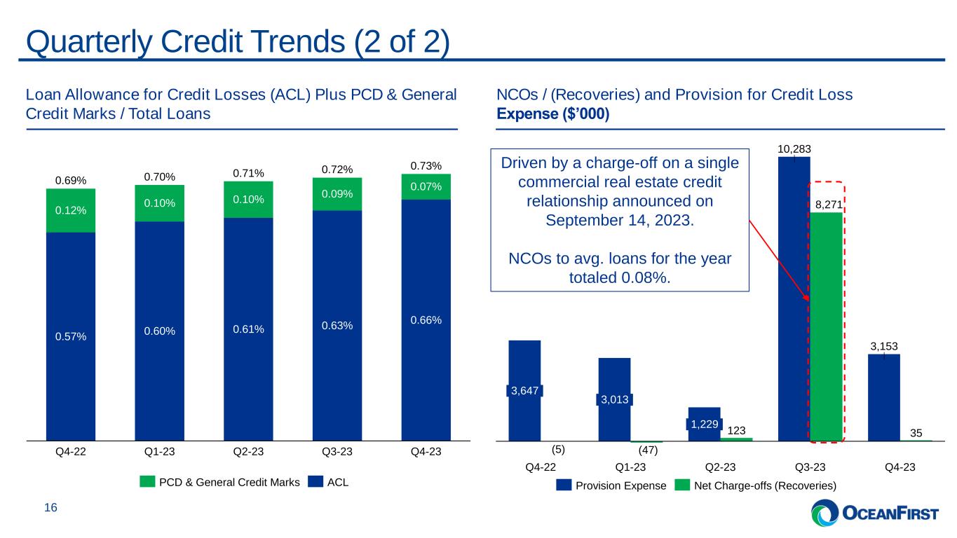 . . . Strong asset quality trends driven by prudent loan growth and credit decisioning. Quarterly Credit Trends (1 of 2) 15 Non-Performing Loans and Assets ($’000)1 Special Mention and Substandard Loans ($’000) Note: At December 31, 2023, of the Special Mention loans and Substandard loans represented above, 96.3% and 79.2% were current on payments, respectively. Note #2: Peer data is on a one quarter lag. 0.19% 0.15% Q4-22 0.18% 0.14% Q1-23 0.19% Q2-23 0.27% 0.20% 8,783 Q3-23 0.26% 0.19% 8,783 Q4-23 Non-performing loans to total loans Non-performing assets to total assets NPL - single CRE relationship Non-performing loans 19,321 18,508 17,582 (1) PCD loans are not included in these metrics. Refer to Asset Quality section in the Earnings Release for additional information. 19,587 86,765 88,152 86,596 106,55148,214 23,980 30,859 44,940 40,386 2.46% 1.00% 50,776 Q4-22 1.10% Q1-23 2.53% 1.18% Q2-23 2.70% 1.30% Q3-23 1.44% Q4-23 2.39% Peer Average Criticized Loans / Total Loans OCFC Criticized Loans / Total Loans Special Mention Substandard 18,138 0.14% Criticized loans as a % of total loans remain low at 1.44% as of Q4-23 compared to our historical 10-year average of 2.40%. In Q3-23, the Bank charged-off $8 million on a single CRE credit relationship. The remaining exposure of $9 million is included in the non- performing loan balance at Q3-23 and Q4-23. OCFC 10-Year (2014-2023) Average Criticized Loans / Total Loans = 2.40%
