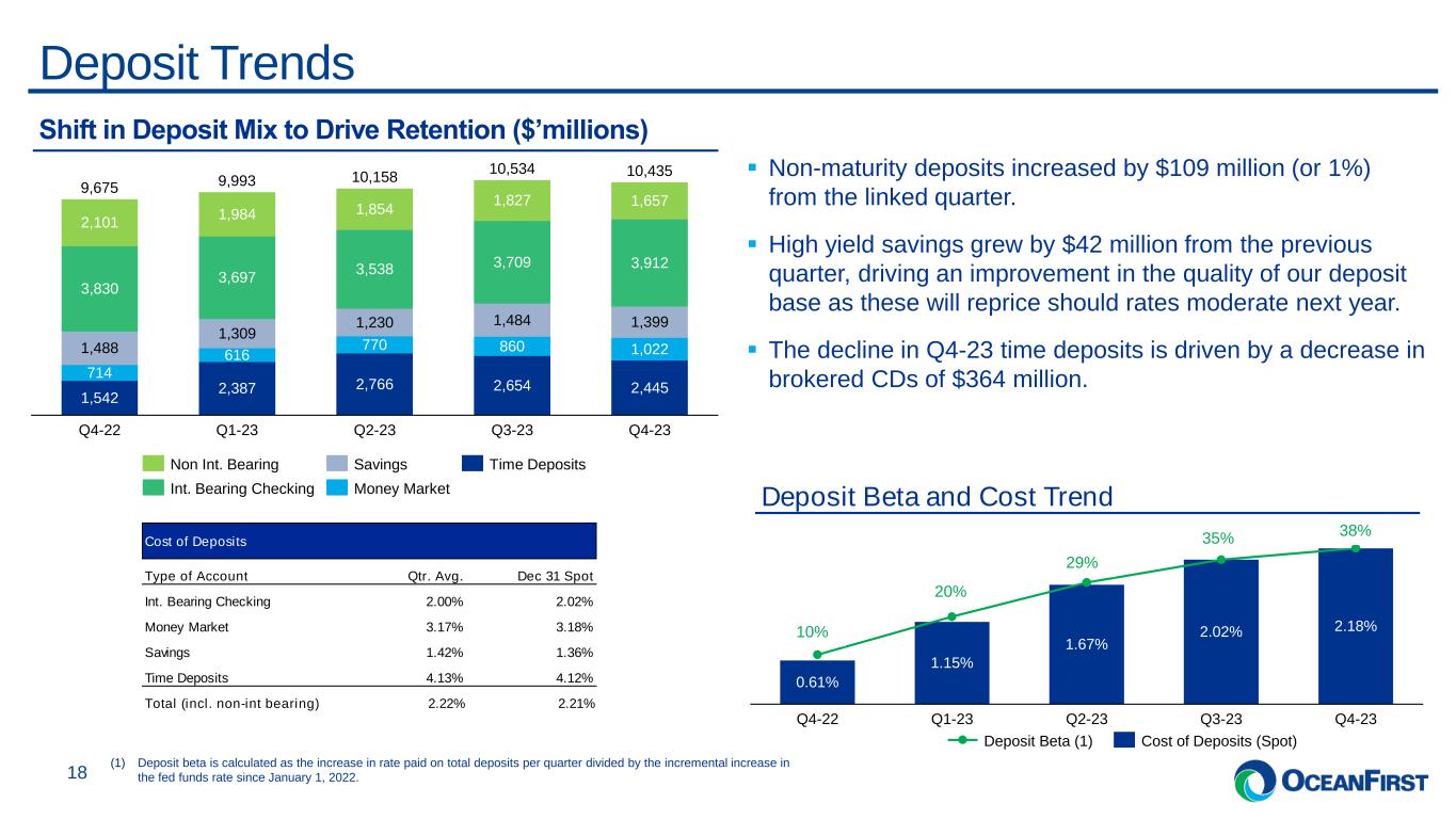 . . . COVID-19 Pandemic Track Record of Strong Credit Performance 17 ▪ From 2006 to 2022, inclusive of the Global Financial Crisis, Hurricane Sandy, and the COVID-19 Pandemic, OCFC’s CRE NCO to average CRE loans totaled 6 bps per year compared to 81 bps for all commercial banks between $10 - $50 billion in assets. ▪ From 2006 to 2022, peak CRE net charge-offs for OCFC totaled 47 bps in 2020, related to proactively de-risking our balance sheet. Peak CRE charge-offs for commercial banks between $10 - $50 billion in assets were 455 bps in 2010. 2006 2007 2008 2009 2010 2011 2012 2013 2014 2015 2016 2017 2018 2019 2020 2021 2022 Q1-23 Q2-23 Q3-23 Q4-23 OCFC CRE NCO / Avg Assets OCFC NCO / Avg Assets Commercial Banks ($10-50 bn) CRE NCO / Avg Assets Commercial Banks ($10-50 bn) NCO / Avg Assets Global Financial Crisis Cumulative CRE charge-offs for OCFC between 2006 and Q4-23 were minimal, totaling $35 million. Hurricane Sandy Source: S&P Global. Note: Commercial bank reporting is on a one quarter lag.