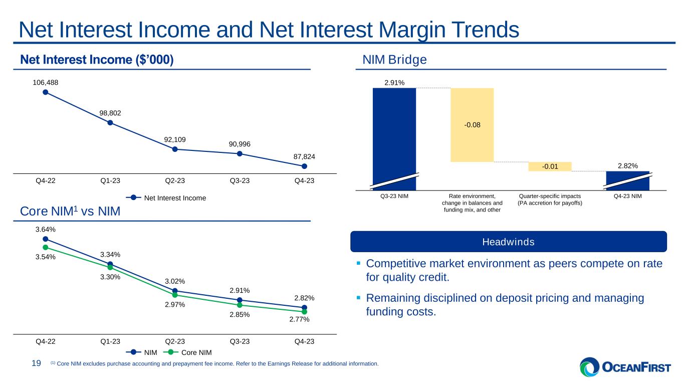 . . .Deposit Trends 18 (1) Deposit beta is calculated as the increase in rate paid on total deposits per quarter divided by the incremental increase in the fed funds rate since January 1, 2022. ▪ Non-maturity deposits increased by $109 million (or 1%) from the linked quarter. ▪ High yield savings grew by $42 million from the previous quarter, driving an improvement in the quality of our deposit base as these will reprice should rates moderate next year. ▪ The decline in Q4-23 time deposits is driven by a decrease in brokered CDs of $364 million. Shift in Deposit Mix to Drive Retention ($’millions) 10.00% 0.61% Q4-22 20.00% 1.15% Q1-23 29.00% 1.67% Q2-23 35.00% 2.02% Q3-23 38.00% 2.18% Q4-23 Deposit Beta (1) Cost of Deposits (Spot) 1,542 2,387 2,766 2,654 2,445 714 616 770 860 1,0221,488 1,309 1,230 1,484 1,399 3,830 3,697 3,538 3,709 3,912 2,101 1,984 1,854 1,827 1,657 Q4-22 Q1-23 Q2-23 Q3-23 Q4-23 9,675 9,993 10,158 10,534 10,435 Non Int. Bearing Int. Bearing Checking Savings Money Market Time Deposits Deposit Beta and Cost Trend 10% 20% 29% 35% 38% Cost of Deposits Type of Account Qtr. Avg. Dec 31 Spot Int. Bearing Checking 2.00% 2.02% Money Market 3.17% 3.18% Savings 1.42% 1.36% Time Deposits 4.13% 4.12% Total (incl. non-int bearing) 2.22% 2.21%