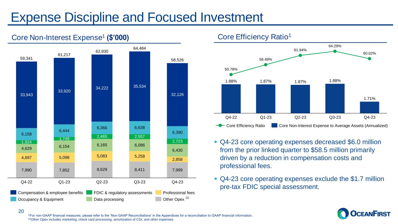 . . .Net Interest Income and Net Interest Margin Trends 19 (1) Core NIM excludes purchase accounting and prepayment fee income. Refer to the Earnings Release for additional information. Core NIM1 vs NIM NIM Bridge Q3-23 NIM -0.08 Rate environment, change in balances and funding mix, and other -0.01 Quarter-specific impacts (PA accretion for payoffs) Q4-23 NIM 2.91% 2.82% 3.64% 3.54% Q4-22 3.34% 3.30% Q1-23 3.02% 2.97% Q2-23 2.91% 2.85% Q3-23 2.82% 2.77% Q4-23 NIM Core NIM Net Interest Income ($’000) 106,488 Q4-22 98,802 Q1-23 92,109 Q2-23 90,996 Q3-23 87,824 Q4-23 Net Interest Income Headwinds ▪ Competitive market environment as peers compete on rate for quality credit. ▪ Remaining disciplined on deposit pricing and managing funding costs.