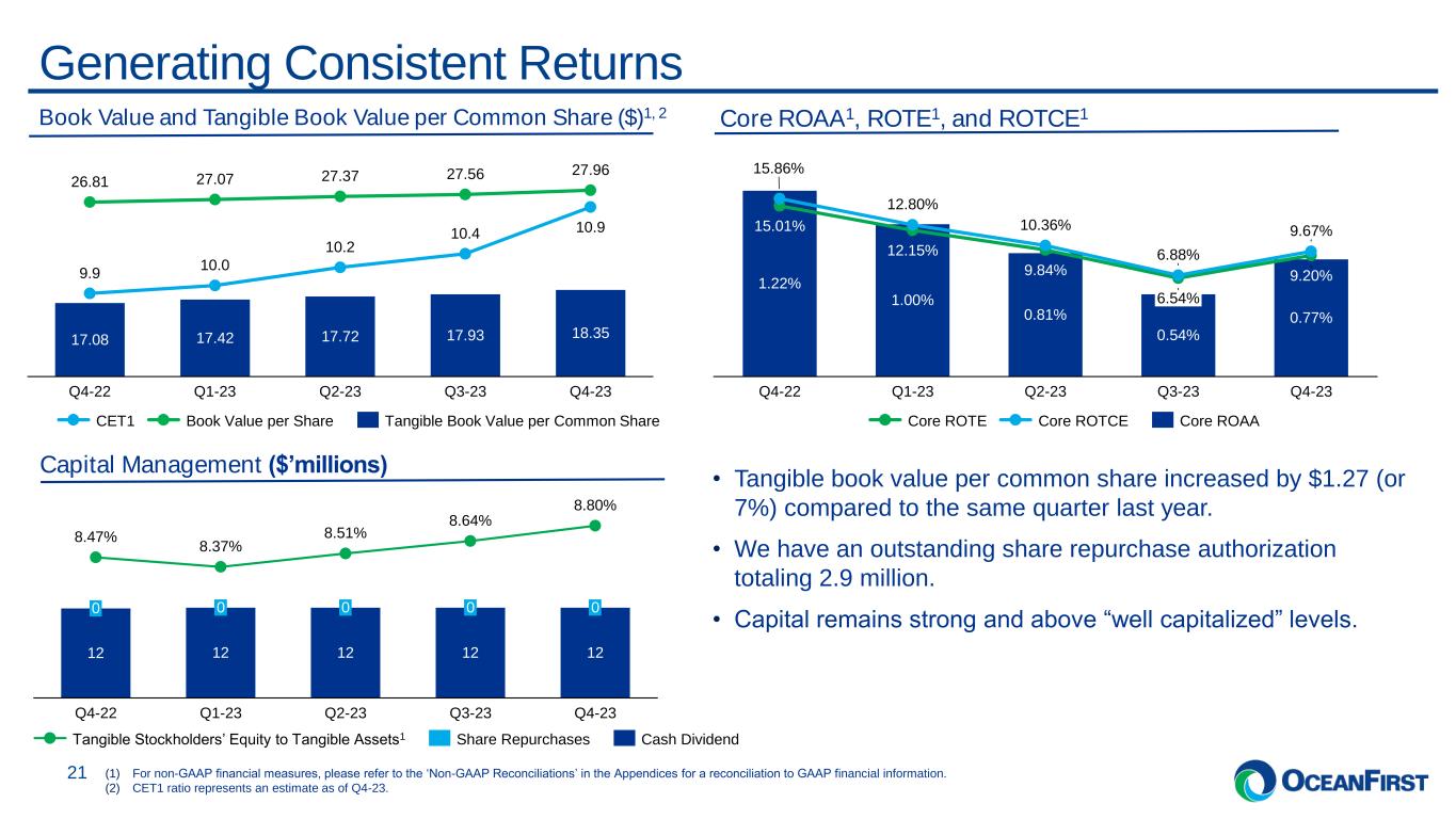 . . . Core Efficiency Ratio1 Expense Discipline and Focused Investment 20 Core Non-Interest Expense1 ($’000) 7,990 7,852 8,629 8,411 7,999 4,697 5,098 5,083 5,258 2,858 4,629 6,154 6,165 6,086 6,430 1,924 1,749 2,465 2,557 2,723 6,158 6,444 6,366 6,638 6,390 33,943 33,920 34,222 35,534 32,126 Q4-22 Q1-23 Q2-23 Q3-23 Q4-23 59,341 61,217 62,930 64,484 58,526 Compensation & employee benefits Occupancy & Equipment FDIC & regulatory assessments Data processing Professional fees Other Opex 50.78% Q4-22 56.49% Q1-23 61.94% Q2-23 64.29% Q3-23 60.02% Q4-23 1.88% 1.87% 1.87% 1.88% 1.71% Core Efficiency Ratio Core Non-Interest Expense to Average Assets (Annualized) (1For non-GAAP financial measures, please refer to the ‘Non-GAAP Reconciliations’ in the Appendices for a reconciliation to GAAP financial information. (2)Other Opex includes marketing, check card processing, amortization of CDI, and other expenses. ▪ Q4-23 core operating expenses decreased $6.0 million from the prior linked quarter to $58.5 million primarily driven by a reduction in compensation costs and professional fees. ▪ Q4-23 core operating expenses exclude the $1.7 million pre-tax FDIC special assessment. (2)