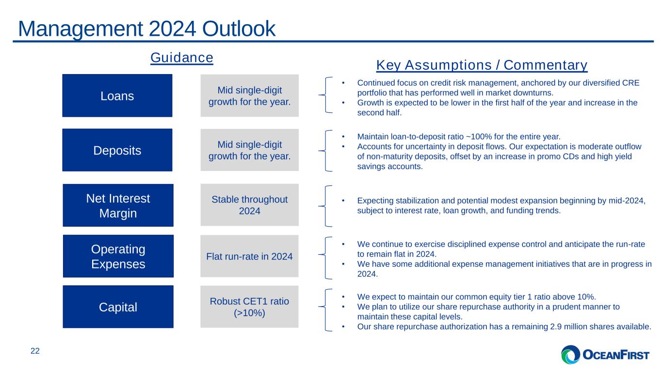 . . .Generating Consistent Returns 21 Book Value and Tangible Book Value per Common Share ($)1, 2 Core ROAA1, ROTE1, and ROTCE1 • Tangible book value per common share increased by $1.27 (or 7%) compared to the same quarter last year. • We have an outstanding share repurchase authorization totaling 2.9 million. • Capital remains strong and above “well capitalized” levels. Capital Management ($’millions) 17.08 17.42 17.72 17.93 18.35 26.81 27.07 27.37 27.56 27.96 9.9 10.0 10.2 10.4 10.9 Q4-22 Q1-23 Q2-23 Q3-23 Q4-23 CET1 Book Value per Share Tangible Book Value per Common Share 15.01% 15.86% 1.22% Q4-22 12.15% 12.80% 1.00% Q1-23 9.84% 10.36% 0.81% Q2-23 6.54% 6.88% 0.54% Q3-23 9.20% 9.67% 0.77% Q4-23 Core ROTE Core ROTCE Core ROAA 12 12 12 12 12 8.47% 0 Q4-22 8.37% 0 Q1-23 8.51% 0 Q2-23 8.64% 0 Q3-23 8.80% 0 Q4-23 Tangible Stockholders’ Equity to Tangible Assets1 Share Repurchases Cash Dividend (1) For non-GAAP financial measures, please refer to the ‘Non-GAAP Reconciliations’ in the Appendices for a reconciliation to GAAP financial information. (2) CET1 ratio represents an estimate as of Q4-23.