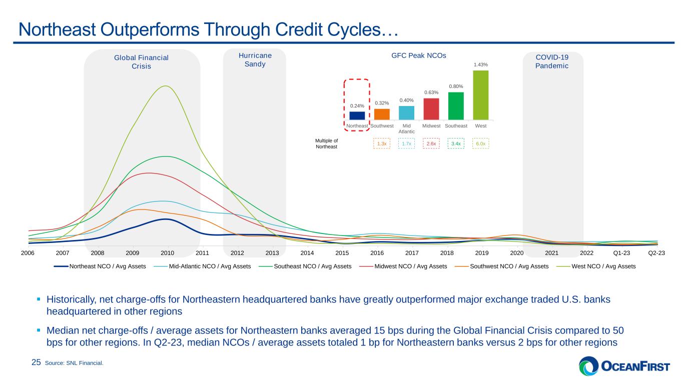 . . .CBD Office Concentration Exposure Is Moderate 24 CBD Office Portfolio by Geography 13% 36% 33% 18% New York City Newark Boston Philadelphia Central Business District (CBD) - Office $'millions Book Balance % of Total WA LTV WA DSCR Credit Tenant 44 35.6% 61.3 1.79 Office 42 33.8% 56.2 2.02 Life Sciences & Medical 38 30.6% 80.6 1.33 CBD - Office 123 11.3% 65.5 1.73 % of Total Loans 1.2% CRE Investor Owned: Office (All Geographies) $'millions Book Balance % of Total WA LTV WA DSCR Office 533 48.2% 51.8 1.78 Medical 346 31.3% 57.8 1.92 Credit Tenant 228 20.6% 64.6 1.62 Total Office 1,106 100.0% 56.3 1.79 % of Total Loans 10.8% CBD Proportion of Total Assets 99% 1% CBD Non-CBD Office Loan Classifications 98% 2% Criticized & Classified Non Criticized & Classified Central business district (CBD) loans have a weighted average LTV of 65.5% and weighted average DSCR of 1.73.
