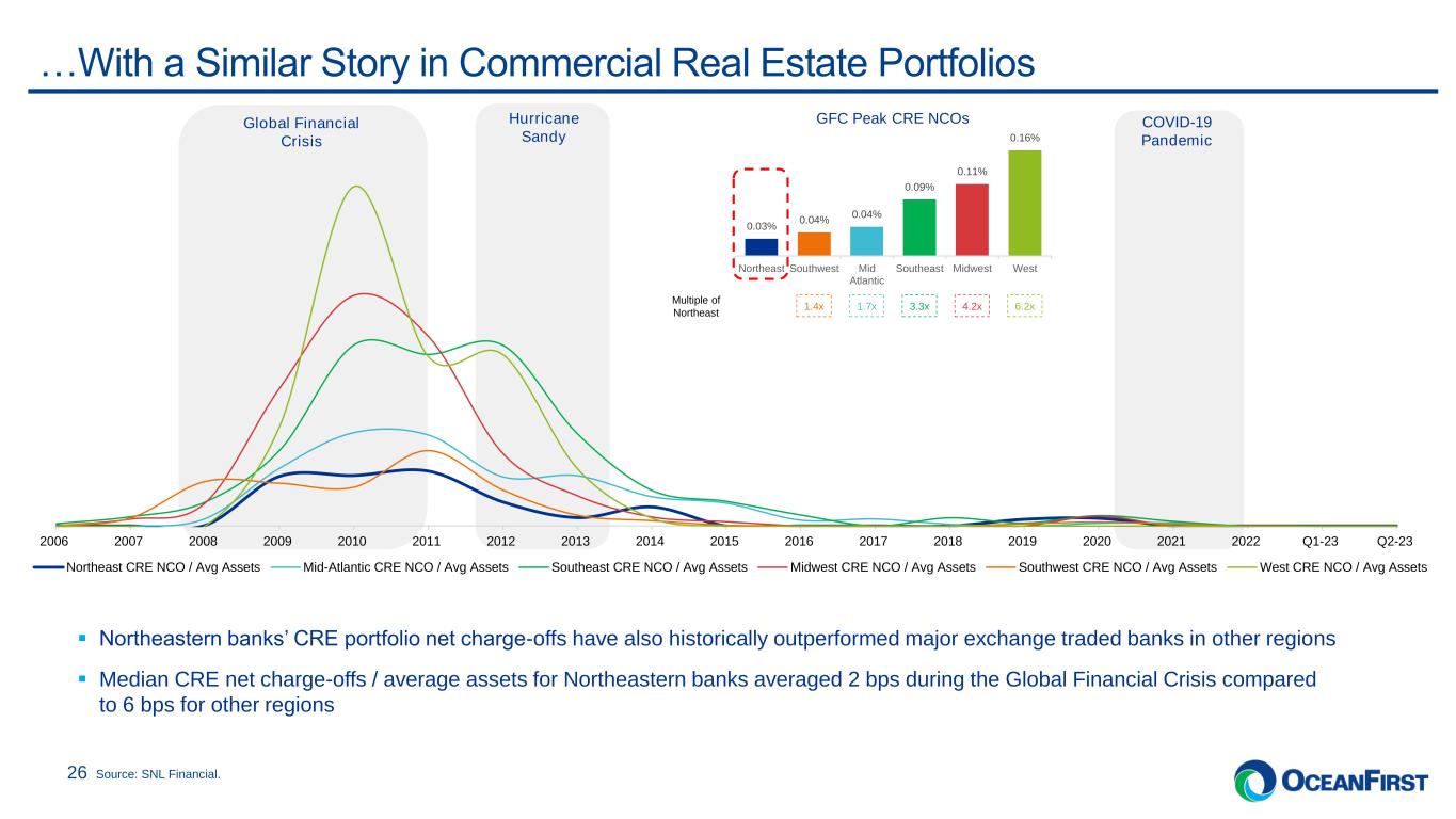 . . . COVID-19 Pandemic Northeast Outperforms Through Credit Cycles… 25 ▪ Historically, net charge-offs for Northeastern headquartered banks have greatly outperformed major exchange traded U.S. banks headquartered in other regions ▪ Median net charge-offs / average assets for Northeastern banks averaged 15 bps during the Global Financial Crisis compared to 50 bps for other regions. In Q2-23, median NCOs / average assets totaled 1 bp for Northeastern banks versus 2 bps for other regions Global Financial Crisis Hurricane Sandy 2006 2007 2008 2009 2010 2011 2012 2013 2014 2015 2016 2017 2018 2019 2020 2021 2022 Q1-23 Q2-23 Northeast NCO / Avg Assets Mid-Atlantic NCO / Avg Assets Southeast NCO / Avg Assets Midwest NCO / Avg Assets Southwest NCO / Avg Assets West NCO / Avg Assets Source: SNL Financial. GFC Peak NCOs 1.3x 1.7x 2.6x 6.0x3.4x Multiple of Northeast 0.24% 0.32% 0.40% 0.63% 0.80% 1.43% Northeast Southwest Mid Atlantic Midwest Southeast West