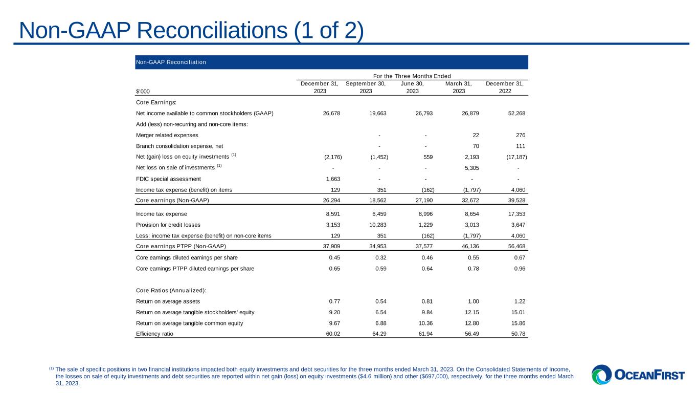 . . .Non-GAAP Reconciliations (1 of 2) (1) The sale of specific positions in two financial institutions impacted both equity investments and debt securities for the three months ended March 31, 2023. On the Consolidated Statements of Income, the losses on sale of equity investments and debt securities are reported within net gain (loss) on equity investments ($4.6 million) and other ($697,000), respectively, for the three months ended March 31, 2023. Non-GAAP Reconciliation For the Three Months Ended $'000 December 31, 2023 September 30, 2023 June 30, 2023 March 31, 2023 December 31, 2022 Core Earnings: Net income available to common stockholders (GAAP) 26,678 19,663 26,793 26,879 52,268 Add (less) non-recurring and non-core items: Merger related expenses - - 22 276 Branch consolidation expense, net - - 70 111 Net (gain) loss on equity investments (1) (2,176) (1,452) 559 2,193 (17,187) Net loss on sale of investments (1) - - - 5,305 - FDIC special assessment 1,663 - - - - Income tax expense (benefit) on items 129 351 (162) (1,797) 4,060 Core earnings (Non-GAAP) 26,294 18,562 27,190 32,672 39,528 Income tax expense 8,591 6,459 8,996 8,654 17,353 Provision for credit losses 3,153 10,283 1,229 3,013 3,647 Less: income tax expense (benefit) on non-core items 129 351 (162) (1,797) 4,060 Core earnings PTPP (Non-GAAP) 37,909 34,953 37,577 46,136 56,468 Core earnings diluted earnings per share 0.45 0.32 0.46 0.55 0.67 Core earnings PTPP diluted earnings per share 0.65 0.59 0.64 0.78 0.96 Core Ratios (Annualized): Return on average assets 0.77 0.54 0.81 1.00 1.22 Return on average tangible stockholders' equity 9.20 6.54 9.84 12.15 15.01 Return on average tangible common equity 9.67 6.88 10.36 12.80 15.86 Efficiency ratio 60.02 64.29 61.94 56.49 50.78