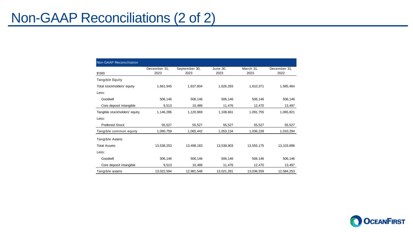 . . .Non-GAAP Reconciliations (2 of 2) Non-GAAP Reconciliation $'000 December 31, 2023 September 30, 2023 June 30, 2023 March 31, 2023 December 31, 2022 Tangible Equity Total stockholders' equity 1,661,945 1,637,604 1,626,283 1,610,371 1,585,464 Less: Goodwill 506,146 506,146 506,146 506,146 506,146 Core deposit intangible 9,513 10,489 11,476 12,470 13,497 Tangible stockholders' equity 1,146,286 1,120,969 1,108,661 1,091,755 1,065,821 Less: Preferred Stock 55,527 55,527 55,527 55,527 55,527 Tangible common equity 1,090,759 1,065,442 1,053,134 1,036,228 1,010,294 Tangible Assets Total Assets 13,538,253 13,498,183 13,538,903 13,555,175 13,103,896 Less: Goodwill 506,146 506,146 506,146 506,146 506,146 Core deposit intangible 9,513 10,489 11,476 12,470 13,497 Tangible assets 13,022,594 12,981,548 13,021,281 13,036,559 12,584,253