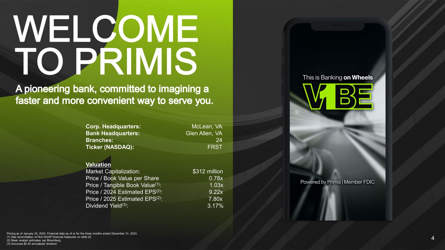 Statements included in this presentation include non - GAAP financial measures and should be read along with the accompanying tabl es. Primis uses non - GAAP financial measures to analyze its performance. The measures entitled net income adjusted for nonrecurring income a nd expenses; pre - tax pre - provision operating earnings; operating return on average assets; pre - tax pre - provision return on average assets; pre - tax pre - provision operating return on average assets; operating return on average equity; operating return on average tangible equity ; o perating efficiency ratio; operating earnings per share – basic; operating earnings per share – diluted; tangible book value per share; tangible c ommon equity; tangible common equity to tangible assets; and core net interest margin are not measures recognized under GAAP and therefore are considered non - GAAP financial measures. We use the term “operating” to describe a financial measure that excludes income or expense conside red to be non - recurring in nature. Items identified as non - operating are those that, when excluded from a reported financial measure, pro vide management or the reader with a measure that may be more indicative of forward - looking trends in our business. A reconciliation of these n on - GAAP financial measures to the most comparable GAAP measures is provided in the Reconciliation of Non - GAAP Items table. Management believes that these non - GAAP financial measures provide additional useful information about Primis that allows manage ment and investors to evaluate the ongoing operating results, financial strength and performance of Primis and provide meaningful comp ari son to its peers. Non - GAAP financial measures should not be considered as an alternative to any measure of performance or financial condition as p romulgated under GAAP, and investors should consider Primis’ performance and financial condition as reported under GAAP and all other re lev ant information when assessing the performance or financial condition of Primis. Non - GAAP financial measures are not standardized a nd, therefore, it may not be possible to compare these measures with other companies that present measures having the same or similar names. No n - GAAP financial measures have limitations as analytical tools, and investors should not consider them in isolation or as a substitu te for analysis of the results or financial condition as reported under GAAP. 3