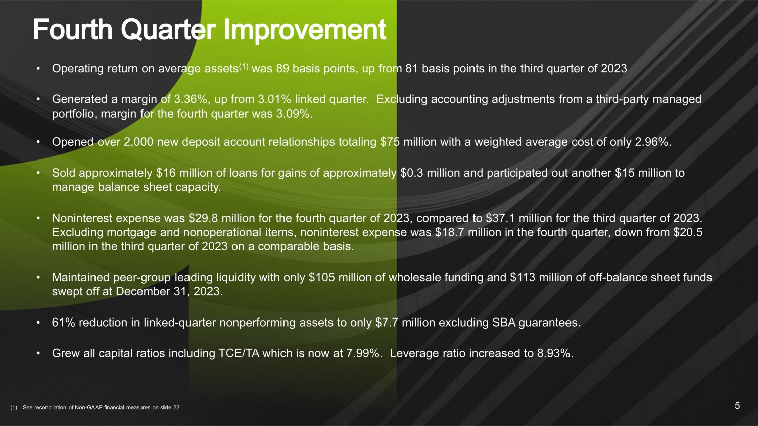 | · | Maintained peer-group leading liquidity with only $105 million of wholesale funding and $113 million of off-balance sheet funds swept off at December 31, 2023. |
