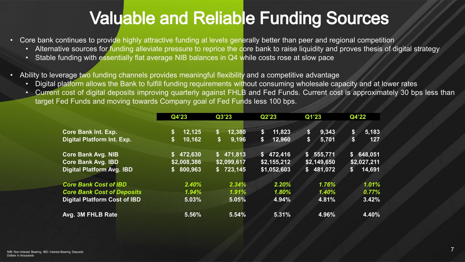 6 • Attractive community bank deposit base with core bank cost of deposits of only 1.94% in Q4 • Added new core bank deposit customers in Q4 with $58 million of deposits at weighted average cost of 2.37% • V1BE adoption/utilization continues to build with users up 16% in Q4, primarily due to addition of small - business customers Deposits per Branch (2) Dollars in Millions. (1) V1BE is a proprietary bank delivery app for on - demand ordering of branch services (2) Deposits per branch includes balances that were swept off. Pro forma includes branch consolidation. 1,179 Users with 166 added in Q4’23 ~$166 million Deposit balance of V1BE users 62% % of V1BE Users that are SMBs V1BE Update (1) 8,765 Q4 Transactions Branch V1BE Customer $140.9 $110.1 $114.5 $114.6 $85.1 Q4'23 Q3'23 Q2'23 Q1'23 Q4'22
