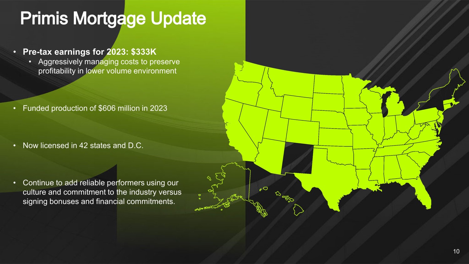 10 • Pre - tax earnings for 2023: $333K • Aggressively managing costs to preserve profitability in lower volume environment • Funded production of $606 million in 2023 • Now licensed in 42 states and D.C. • Continue to add reliable performers using our culture and commitment to the industry versus signing bonuses and financial commitments.
