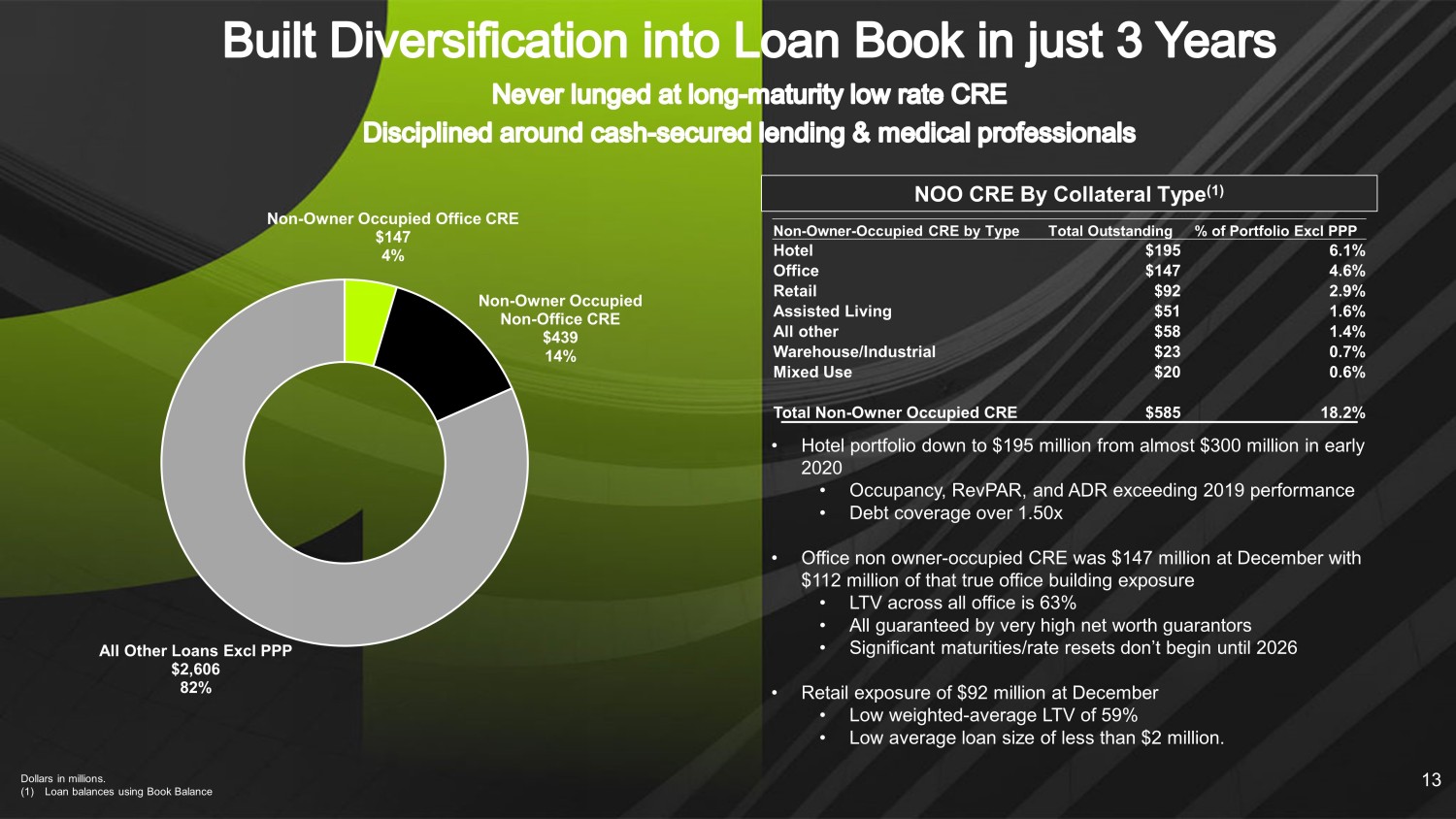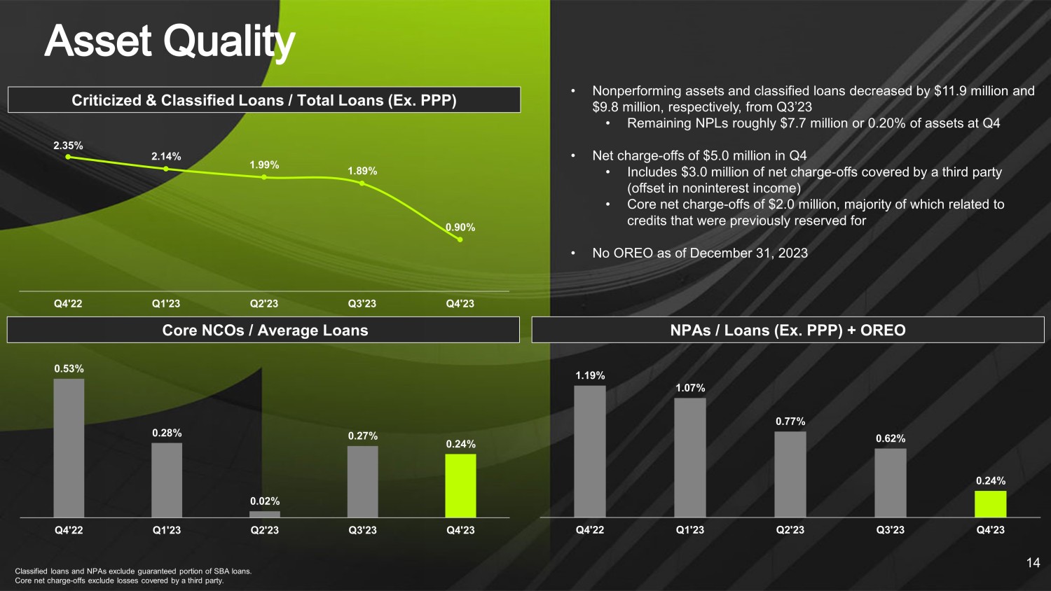 $3,876 $3,833 $3,869 $4,218 $3,569 $3,214 $3,166 $3,194 $3,056 $2,947 $3,270 $3,293 $3,317 $3,668 $2,722 7.99% 7.67% 7.59% 7.07% 8.22% Q4'23 Q3'23 Q2'23 Q1'23 Q4'22 Total Assets Gross Loans Deposits TCE/TA Dollars in millions. (1) See reconciliation of Non - GAAP financial measures on slide 22. 12 (1)