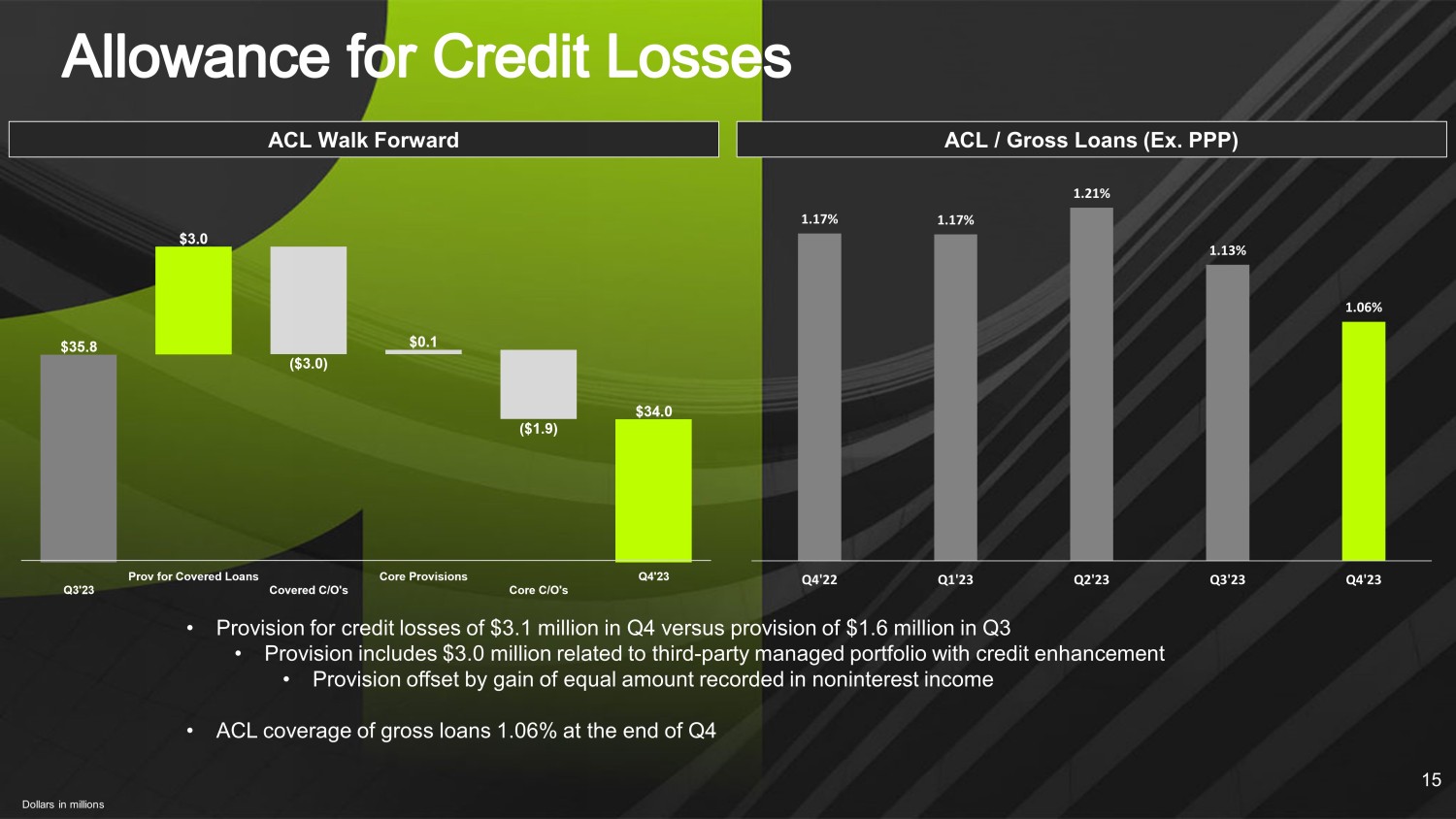 Classified loans and NPAs exclude guaranteed portion of SBA loans. Core net charge - offs exclude losses covered by a third party. 14 NPAs / Loans (Ex. PPP) + OREO Core NCOs / Average Loans Criticized & Classified Loans / Total Loans (Ex. PPP) • Nonperforming assets and classified loans decreased by $11.9 million and $9.8 million, respectively, from Q3’23 • Remaining NPLs roughly $7.7 million or 0.20% of assets at Q4 • Net charge - offs of $5.0 million in Q4 • Includes $3.0 million of net charge - offs covered by a third party (offset in noninterest income) • Core net charge - offs of $2.0 million, majority of which related to credits that were previously reserved for • No OREO as of December 31, 2023 0.53% 0.28% 0.02% 0.27% 0.24% Q4'22 Q1'23 Q2'23 Q3'23 Q4'23 2.35% 2.14% 1.99% 1.89% 0.90% Q4'22 Q1'23 Q2'23 Q3'23 Q4'23 1.19% 1.07% 0.77% 0.62% 0.24% Q4'22 Q1'23 Q2'23 Q3'23 Q4'23
