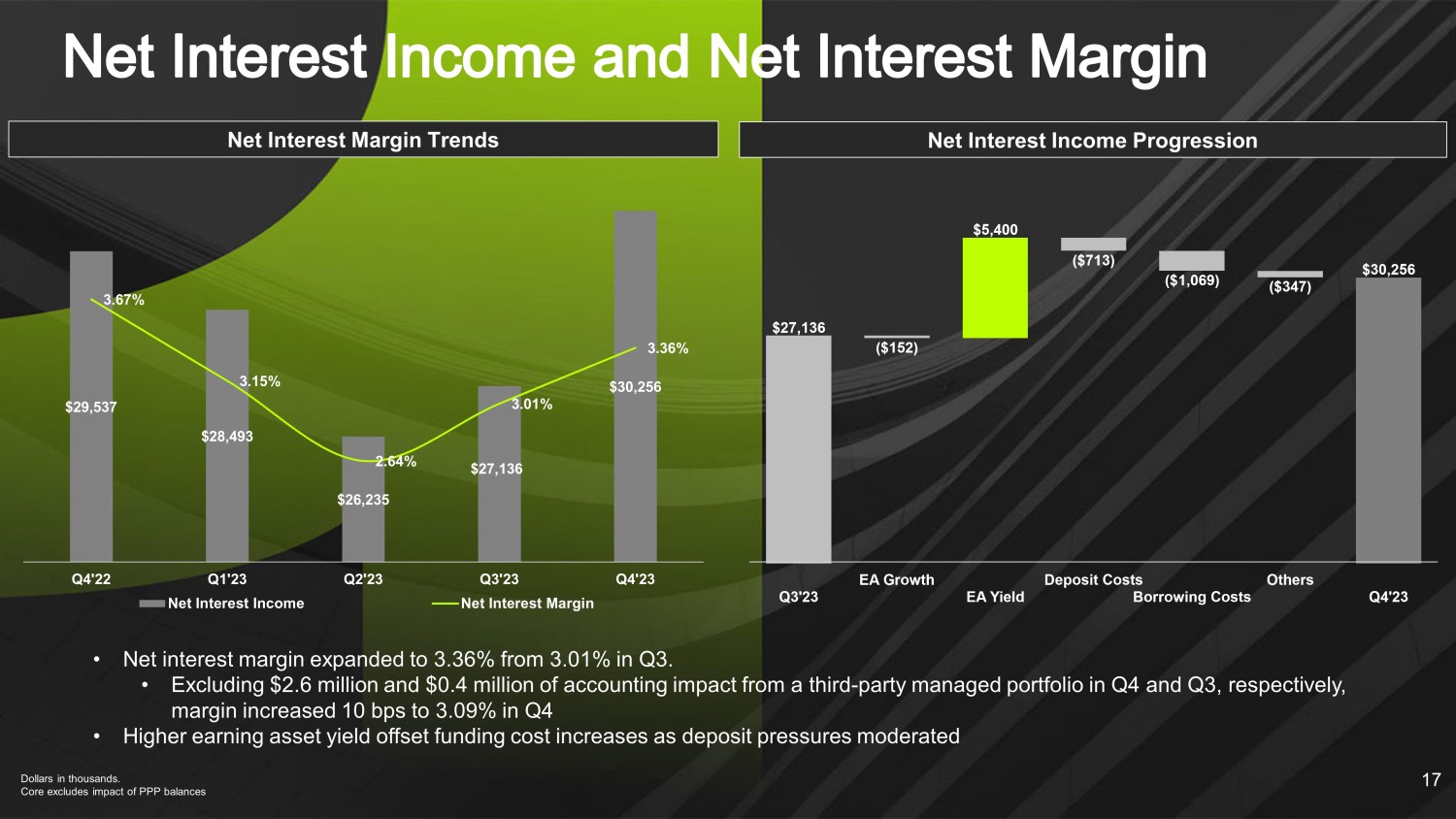 Dollars in millions. (1) Core deposits exclude time deposits and includes deposits that were swept off at 12/31 16 Deposit Composition – Q4’23 Core Deposit Growth (1) • Total deposits were down slightly compared to Q3 as the balance sheet was managed to minimize excess cash • Uninsured/unsecured deposits make up approximately 22% of total deposits with 173% coverage of those balances from external liquidity sources • $75 million brokered deposits, maturing mid - 2024, and $30 million of short - term FHLB advances at December 31, 2023 Cost of Deposits: 269 bps Demand Deposits 14.5% NOW Accounts 23.6% Money Market Accounts 24.3% Savings Accounts 24.0% Time Deposits 13.6% $1,003 $1,502 $1,872 $1,675 $2,580 $339 $441 $530 $583 $473 $1,342 $1,943 $2,403 $2,257 $2,937 1.43% 0.92% 0.48% 0.78% 2.69% 2019 2020 2021 2022 2023 Interest Bearing Deposits Demand Cost of Deposits