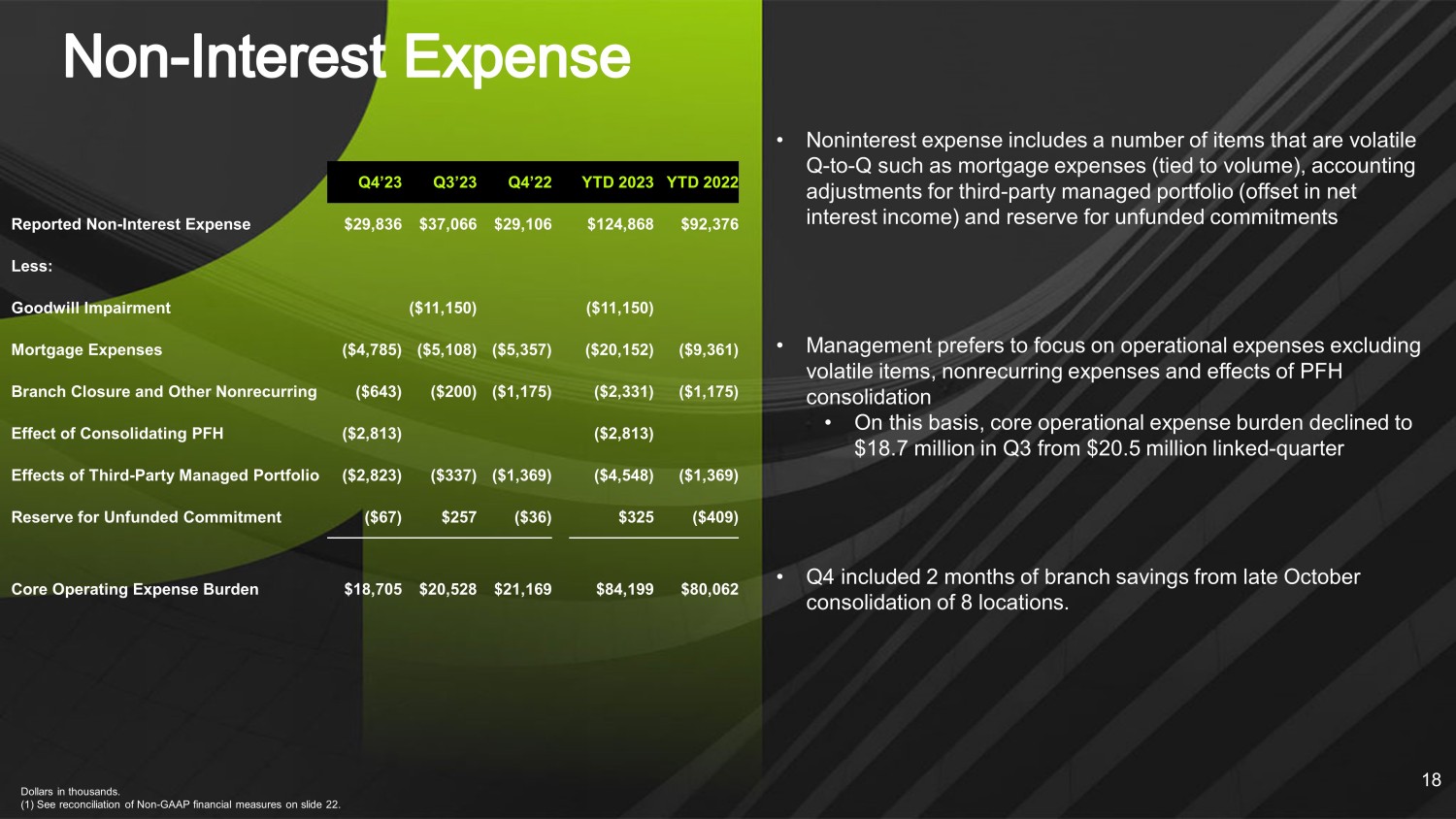 Net Interest Income Progression Dollars in thousands. Core excludes impact of PPP balances 17 • Net interest margin expanded to 3.36% from 3.01% in Q3. • Excluding $2.6 million and $0.4 million of accounting impact from a third - party managed portfolio in Q4 and Q3, respectively, margin increased 10 bps to 3.09% in Q4 • Higher earning asset yield offset funding cost increases as deposit pressures moderated Net Interest Margin Trends $30,256 $27,136 $26,235 $28,493 $29,537 3.36% 3.01% 2.64% 3.15% 3.67% Q4'23 Q3'23 Q2'23 Q1'23 Q4'22 Net Interest Income Net Interest Margin