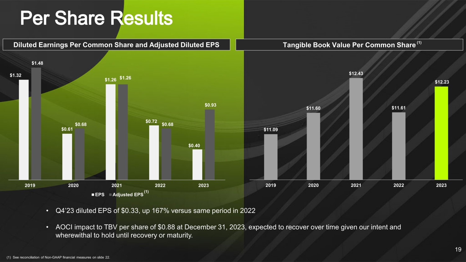 $1.32 $0.61 $1.26 $0.72 $0.40 $1.48 $0.68 $1.26 $0.68 $0.93 2019 2020 2021 2022 2023 EPS Adjusted EPS Tangible Book Value Per Common Share Diluted Earnings Per Common Share and Adjusted Diluted EPS (1) See reconciliation of Non - GAAP financial measures on slide 22. 19 • Q4’23 diluted EPS of $0.33, up 167% versus same period in 2022 • AOCI impact to TBV per share of $0.88 at December 31, 2023, expected to recover over time given our intent and wherewithal to hold until recovery or maturity. (1) (1) $11.09 $11.60 $12.43 $11.61 $12.23 2019 2020 2021 2022 2023