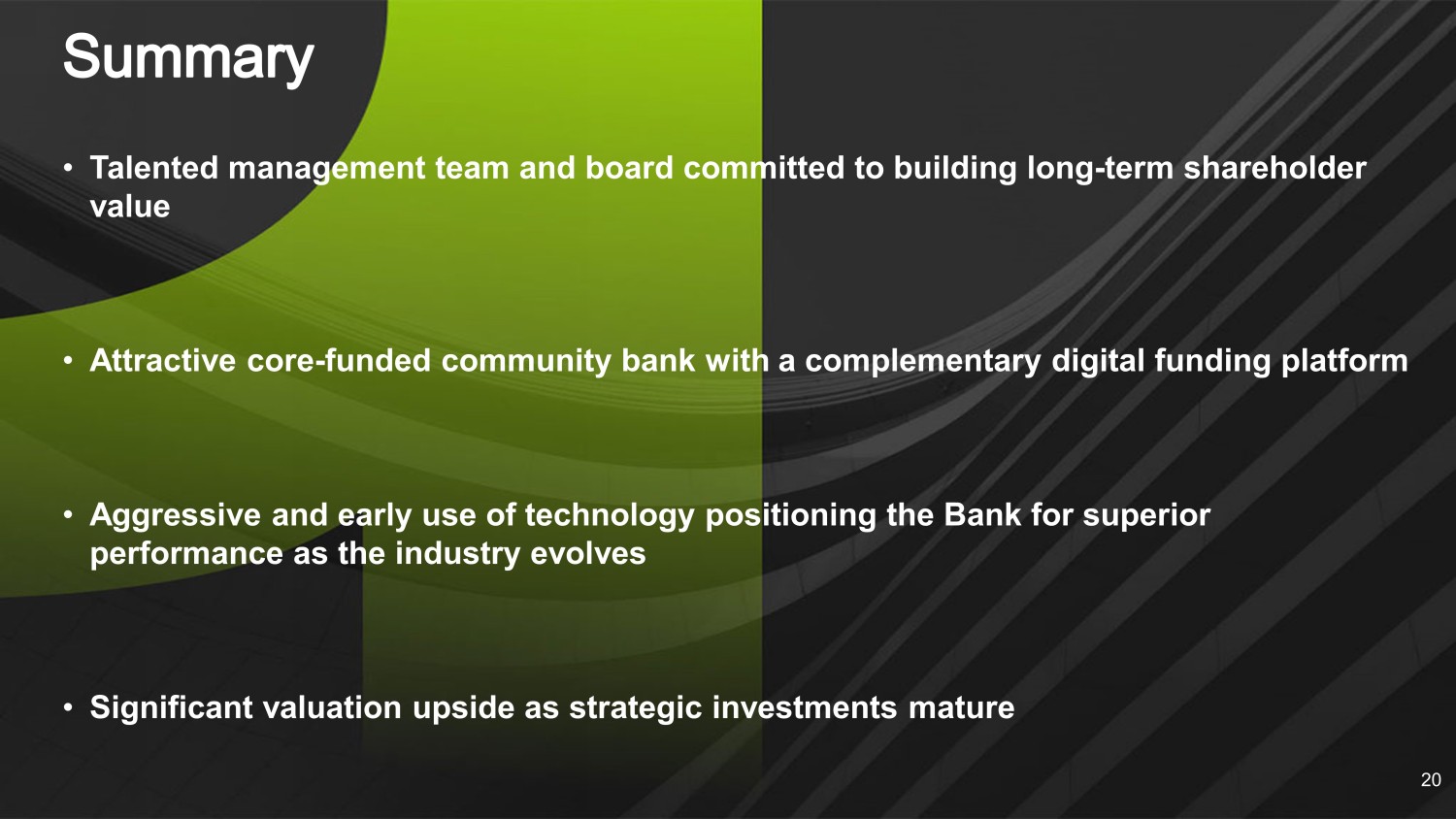 • Talented management team and board committed to building long - term shareholder value • Attractive core - funded community bank with a complementary digital funding platform • Aggressive and early use of technology positioning the Bank for superior performance as the industry evolves • Significant valuation upside as strategic investments mature 20