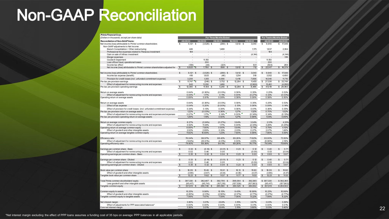 *Net interest margin excluding the effect of PPP loans assumes a funding cost of 35 bps on average PPP balances in all applic abl e periods. 22 Primis Financial Corp. (Dollars in thousands, except per share data) For Three Months Ended: Reconciliation of Non-GAAP items: 4Q 2023 3Q 2023 2Q 2023 1Q 2023 4Q 2022 4Q 2023 4Q 2022 Net income (loss) attributable to Primis' common shareholders 8,121$ (3,526)$ (268)$ 5,612$ 3,040$ 9,940$ 17,549$ Non-GAAP adjustments to Net Income: Branch Consolidation / Other restructuring 449 - 1,488 - 1,175 1,937 2,384 Professional fee expenses related to Panacea investment 194 - - - - 194 Gain on sale of Infinex investment - - - - (4,144) - (4,144) Merger expenses - - - - - - 516 Goodwill impairment - 11,150 - - - 11,150 - Loan officer fraud, operational losses - 200 - - - 200 - Income tax effect (139) (44) (321) - 641 (504) 269 8,625$ 7,780$ 899$ 5,612$ 712$ 22,917$ 16,574$ Net income (loss) attributable to Primis' common shareholders 8,121$ (3,526)$ (268)$ 5,612$ 3,040$ 9,940$ 17,549$ Income tax expense (benefit) 418 1,925 (46) 1,254 519 3,552 4,490 3,208 1,355 4,066 5,418 7,896 14,046 11,710 Pre-tax pre-provision earnings 11,747$ (246)$ 3,752$ 12,284$ 11,455$ 27,538$ 33,749$ 643 11,350 1,488 - (2,969) 13,481 (4,286) Pre-tax pre-provision operating earnings 12,390$ 11,104$ 5,240$ 12,284$ 8,486$ 41,019$ 29,463$ Return on average assets 0.84% (0.36%) (0.03%) 0.58% 0.35% 0.25% 0.53% Effect of adjustment for nonrecurring income and expenses 0.05% 1.17% 0.11% 0.00% (0.27%) 0.33% (0.03%) Operating return on average assets 0.89% 0.81% 0.08% 0.58% 0.08% 0.58% 0.50% Return on average assets 0.84% (0.36%) (0.03%) 0.58% 0.35% 0.25% 0.53% Effect of tax expense 0.04% 0.20% (0.00%) 0.13% 0.06% 0.09% 0.14% 0.34% 0.13% 0.39% 0.56% 0.91% 0.36% 0.35% Pre-tax pre-provision return on average assets 1.22% (0.03%) 0.36% 1.27% 1.32% 0.70% 1.02% 0.07% 1.17% 0.14% 0.00% (0.34%) 0.34% (0.13%) Pre-tax pre-provision operating return on average assets 1.29% 1.14% 0.50% 1.27% 0.98% 1.04% 0.89% Return on average common equity 8.37% (3.54%) (0.27%) 5.64% 3.04% 2.51% 4.35% Effect of adjustment for nonrecurring income and expenses 0.52% 11.34% 1.17% 0.00% (2.33%) 3.28% (0.25%) Operating return on average common equity 8.89% 7.80% 0.90% 5.64% 0.71% 5.79% 4.10% Effect of goodwill and other intangible assets 2.93% 2.89% 0.33% 2.05% 0.27% 2.07% 1.49% Operating return on average tangible common equity 11.82% 10.69% 1.23% 7.69% 0.98% 7.86% 5.59% Efficiency ratio 76.04% 99.97% 88.42% 69.26% 71.82% 83.00% 73.50% (1.64%) (30.61%) (4.31%) 0.00% 4.95% (8.96%) 2.16% Operating efficiency ratio 74.40% 69.36% 84.11% 69.26% 76.77% 74.04% 75.66% Earnings per common share - Basic 0.33$ (0.14)$ (0.01)$ 0.23$ 0.12$ 0.40$ 0.71$ Effect of adjustment for nonrecurring income and expenses 0.02 0.46 0.05 - (0.09) 0.53 (0.04) Operating earnings per common share - Basic 0.35$ 0.32$ 0.04$ 0.23$ 0.03$ 0.93$ 0.67$ Earnings per common share - Diluted 0.33$ (0.14)$ (0.01)$ 0.23$ 0.12$ 0.40$ 0.71$ Effect of adjustment for nonrecurring income and expenses 0.02 0.46 0.05 - (0.09) 0.53 (0.04) Operating earnings per common share - Diluted 0.35$ 0.32$ 0.04$ 0.23$ 0.03$ 0.93$ 0.67$ Book value per common share 16.09$ 15.49$ 15.91$ 16.13$ 15.90$ 16.09$ 15.90$ Effect of goodwill and other intangible assets (3.86) (3.87) (4.34) (4.36) (4.37) (3.86) (4.37) Tangible book value per common share 12.23$ 11.62$ 11.57$ 11.77$ 11.53$ 12.23$ 11.53$ Total Primis common stockholders' equity 397,330$ 382,487$ 392,795$ 398,064$ 392,365$ 397,330$ 392,365$ Less goodwill and other intangible assets (95,417) (95,741) (107,215) (107,539) (107,863) (95,417) (107,863) Tangible common equity 301,913$ 286,746$ 285,580$ 290,525$ 284,502$ 301,913$ 284,502$ Common equity to assets 10.25% 9.98% 10.15% 9.43% 10.99% 10.25% 10.99% Effect of goodwill and other intangible assets (2.26%) (2.31%) (2.56%) (2.37%) (2.77%) (2.27%) (2.77%) Tangible common equity to tangible assets 7.99% 7.67% 7.59% 7.06% 8.22% 7.99% 8.22% Net interest margin 3.36% 3.01% 2.64% 3.15% 3.67% 3.03% 3.39% 0.00% 0.00% 0.00% 0.00% 0.01% 0.00% 0.01% Core net interest margin 3.36% 3.01% 2.64% 3.15% 3.68% 3.03% 3.40% Effect of adjustments for PPP associated balances* Effect of provision for credit losses (incl. unfunded commitment expense) Provision for credit losses (incl. unfunded commitment expense) Effect of adjustment for nonrecurring income and expenses Effect of adjustment for nonrecurring income and expenses Effect of adjustment for nonrecurring income and expenses and expenses Net income (loss) attributable to Primis' common shareholders adjusted for For Twelve Months Ended:
