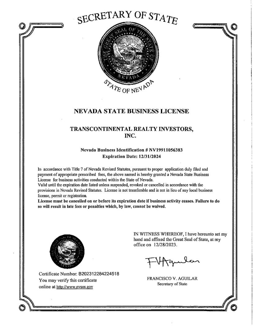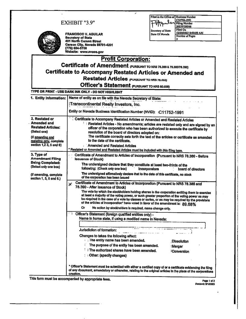 | 3.9* | Certificate of Amendment to the Articles of Incorporation of Transcontinental Realty Investors, Inc. filed December 28, 2023, which amends Article TENTH, Subpart C. |
