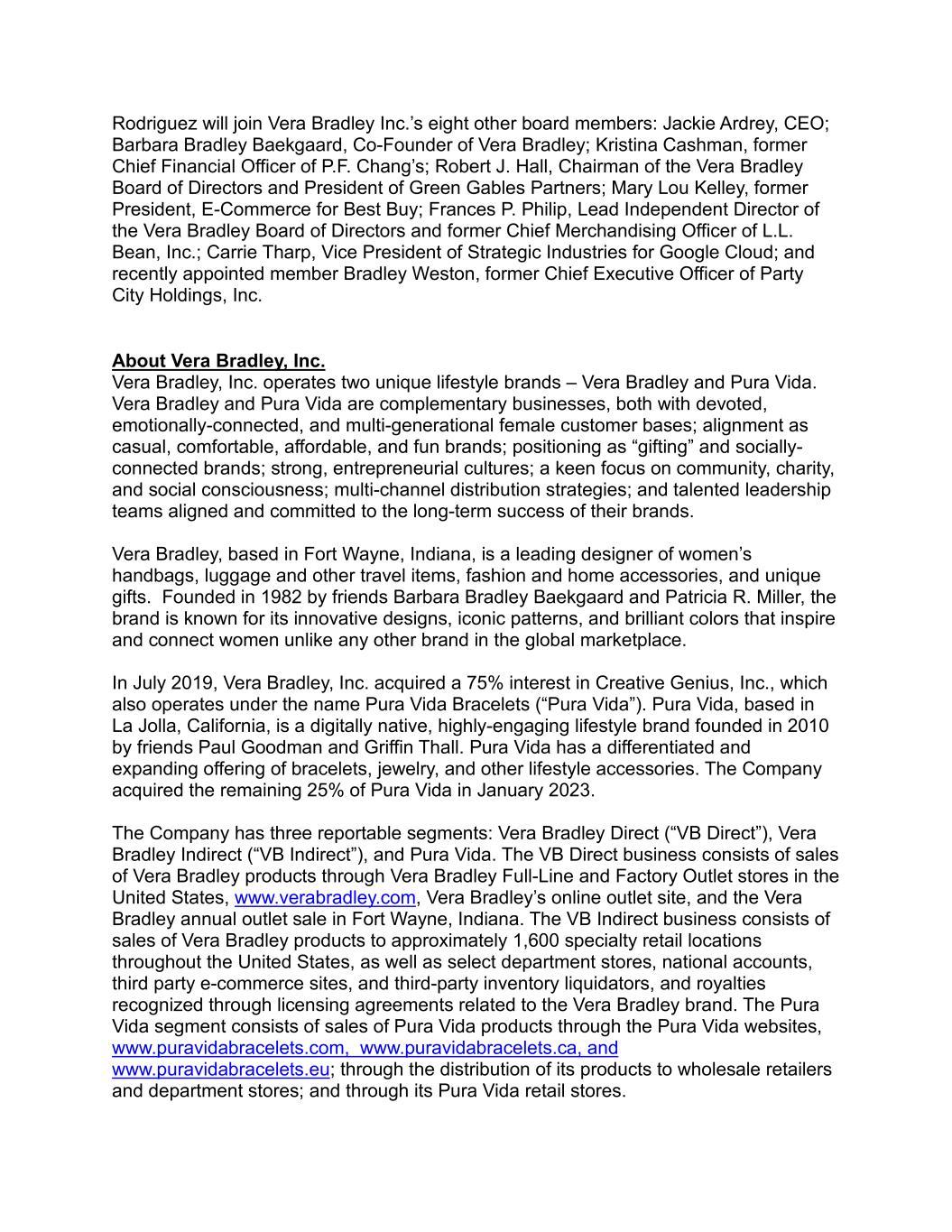 Rodriguez will join Vera Bradley Inc.’s eight other board members: Jackie Ardrey, CEO; Barbara Bradley Baekgaard, Co-Founder of Vera Bradley; Kristina Cashman, former Chief Financial Officer of P.F. Chang’s; Robert J. Hall, Chairman of the Vera Bradley Board of Directors and President of Green Gables Partners; Mary Lou Kelley, former President, E-Commerce for Best Buy; Frances P. Philip, Lead Independent Director of the Vera Bradley Board of Directors and former Chief Merchandising Officer of L.L. Bean, Inc.; Carrie Tharp, Vice President of Strategic Industries for Google Cloud; and recently appointed member Bradley Weston, former Chief Executive Officer of Party City Holdings, Inc. About Vera Bradley, Inc. Vera Bradley, Inc. operates two unique lifestyle brands – Vera Bradley and Pura Vida. Vera Bradley and Pura Vida are complementary businesses, both with devoted, emotionally-connected, and multi-generational female customer bases; alignment as casual, comfortable, affordable, and fun brands; positioning as “gifting” and socially- connected brands; strong, entrepreneurial cultures; a keen focus on community, charity, and social consciousness; multi-channel distribution strategies; and talented leadership teams aligned and committed to the long-term success of their brands. Vera Bradley, based in Fort Wayne, Indiana, is a leading designer of women’s handbags, luggage and other travel items, fashion and home accessories, and unique gifts. Founded in 1982 by friends Barbara Bradley Baekgaard and Patricia R. Miller, the brand is known for its innovative designs, iconic patterns, and brilliant colors that inspire and connect women unlike any other brand in the global marketplace. In July 2019, Vera Bradley, Inc. acquired a 75% interest in Creative Genius, Inc., which also operates under the name Pura Vida Bracelets (“Pura Vida”). Pura Vida, based in La Jolla, California, is a digitally native, highly-engaging lifestyle brand founded in 2010 by friends Paul Goodman and Griffin Thall. Pura Vida has a differentiated and expanding offering of bracelets, jewelry, and other lifestyle accessories. The Company acquired the remaining 25% of Pura Vida in January 2023. The Company has three reportable segments: Vera Bradley Direct (“VB Direct”), Vera Bradley Indirect (“VB Indirect”), and Pura Vida. The VB Direct business consists of sales of Vera Bradley products through Vera Bradley Full-Line and Factory Outlet stores in the United States, www.verabradley.com, Vera Bradley’s online outlet site, and the Vera Bradley annual outlet sale in Fort Wayne, Indiana. The VB Indirect business consists of sales of Vera Bradley products to approximately 1,600 specialty retail locations throughout the United States, as well as select department stores, national accounts, third party e-commerce sites, and third-party inventory liquidators, and royalties recognized through licensing agreements related to the Vera Bradley brand. The Pura Vida segment consists of sales of Pura Vida products through the Pura Vida websites, www.puravidabracelets.com, www.puravidabracelets.ca, and www.puravidabracelets.eu; through the distribution of its products to wholesale retailers and department stores; and through its Pura Vida retail stores.