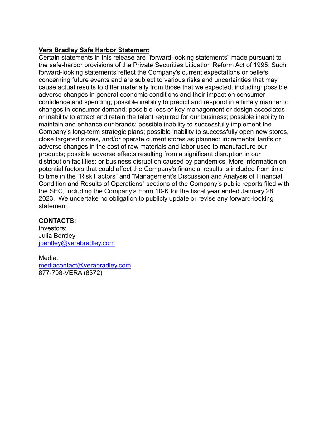 Vera Bradley Safe Harbor Statement Certain statements in this release are "forward-looking statements" made pursuant to the safe-harbor provisions of the Private Securities Litigation Reform Act of 1995. Such forward-looking statements reflect the Company's current expectations or beliefs concerning future events and are subject to various risks and uncertainties that may cause actual results to differ materially from those that we expected, including: possible adverse changes in general economic conditions and their impact on consumer confidence and spending; possible inability to predict and respond in a timely manner to changes in consumer demand; possible loss of key management or design associates or inability to attract and retain the talent required for our business; possible inability to maintain and enhance our brands; possible inability to successfully implement the Company’s long-term strategic plans; possible inability to successfully open new stores, close targeted stores, and/or operate current stores as planned; incremental tariffs or adverse changes in the cost of raw materials and labor used to manufacture our products; possible adverse effects resulting from a significant disruption in our distribution facilities; or business disruption caused by pandemics. More information on potential factors that could affect the Company’s financial results is included from time to time in the “Risk Factors” and “Management’s Discussion and Analysis of Financial Condition and Results of Operations” sections of the Company’s public reports filed with the SEC, including the Company’s Form 10-K for the fiscal year ended January 28, 2023. We undertake no obligation to publicly update or revise any forward-looking statement. CONTACTS: Investors: Julia Bentley jbentley@verabradley.com Media: mediacontact@verabradley.com 877-708-VERA (8372)