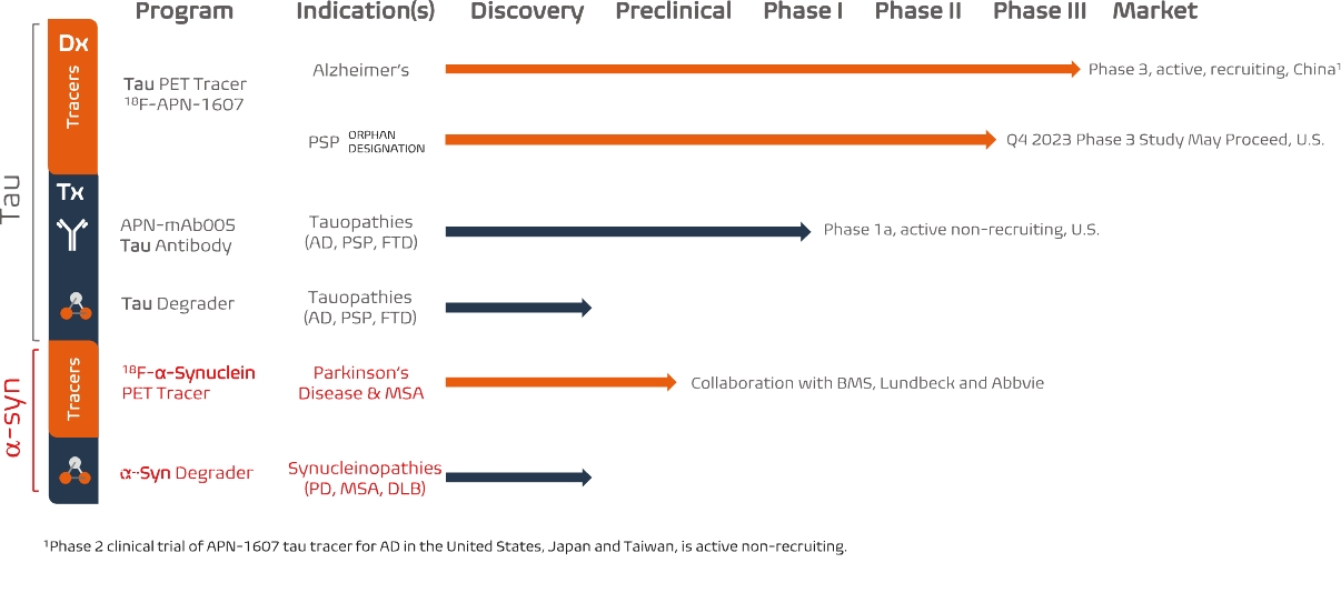 • | Our lead diagnostic product candidate (APN-1607). APN-1607 is our 3R/4R tau PET tracer and most clinically advanced diagnostic product candidate. APN-1607 is designed as a new generation tau PET tracer |