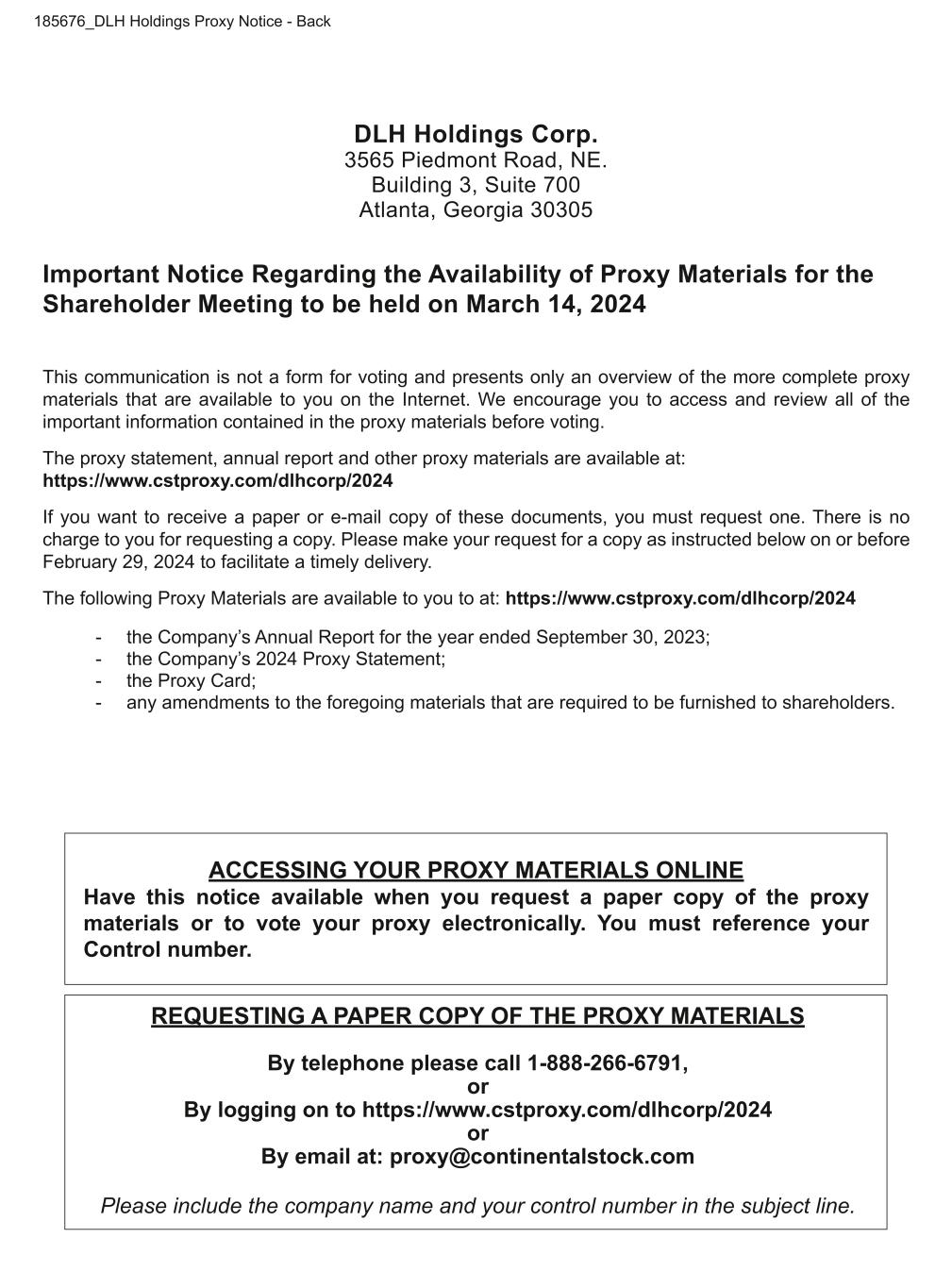 DLH Holdings Corp. 3565 Piedmont Road, NE. Building 3, Suite 700 Atlanta, Georgia 30305 Important Notice Regarding the Availability of Proxy Materials for the Shareholder Meeting to be held on March 14, 2024 This communication is not a form for voting and presents only an overview of the more complete proxy materials that are available to you on the Internet. We encourage you to access and review all of the important information contained in the proxy materials before voting. The proxy statement, annual report and other proxy materials are available at: https://www.cstproxy.com/dlhcorp/2024 If you want to receive a paper or e-mail copy of these documents, you must request one. There is no charge to you for requesting a copy. Please make your request for a copy as instructed below on or before February 29, 2024 to facilitate a timely delivery. The following Proxy Materials are available to you to at: https://www.cstproxy.com/dlhcorp/2024 - the Company’s Annual Report for the year ended September 30, 2023; - the Company’s 2024 Proxy Statement; - the Proxy Card; - any amendments to the foregoing materials that are required to be furnished to shareholders. ACCESSING YOUR PROXY MATERIALS ONLINE Have this notice available when you request a paper copy of the proxy materials or to vote your proxy electronically. You must reference your Control number. REQUESTING A PAPER COPY OF THE PROXY MATERIALS By telephone please call 1-888-266-6791, or By logging on to https://www.cstproxy.com/dlhcorp/2024 or By email at: proxy@continentalstock.com Please include the company name and your control number in the subject line. 185676_DLH Holdings Proxy Notice - Back