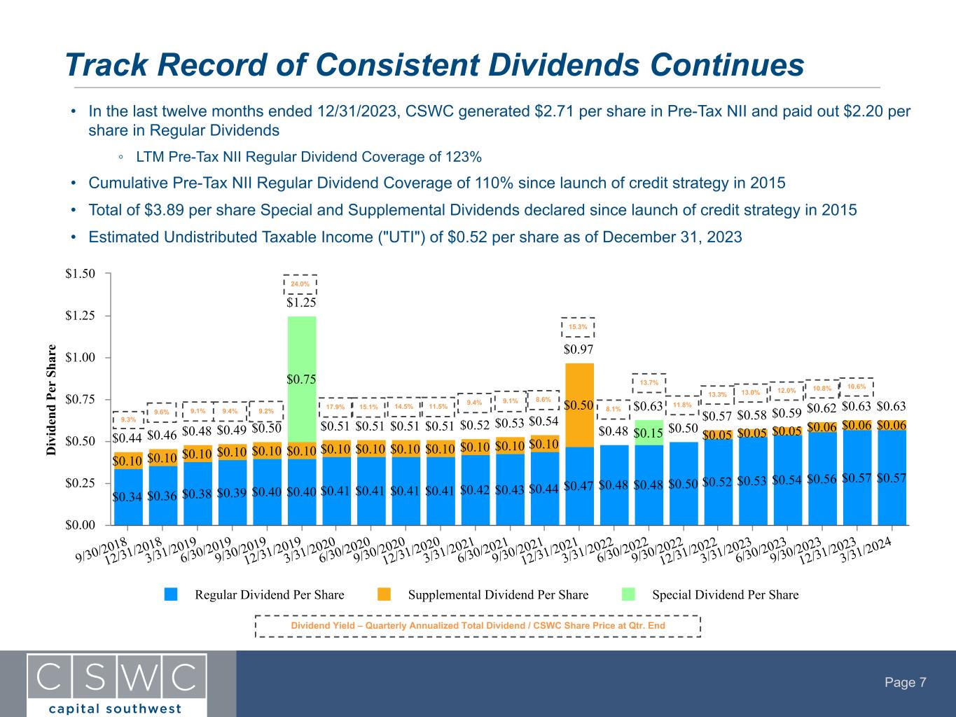 Page 6 • Q3 2024 Pre-Tax Net Investment Income (“NII”) of $29.8 MM or $0.72 per share • Declared Regular Dividend of $0.57 per share for the quarter ending March 31, 2024 ◦ Declared Supplemental Dividend of $0.06 per share for the quarter ending March 31, 2024 • Investment Portfolio at Fair Value increased to $1.37 B from $1.35 B in prior quarter ◦ $116.3 MM in total new committed investments to four new portfolio companies and twelve existing portfolio companies ◦ $79.0 MM in total proceeds from five debt prepayments and one equity exit generating realized gains of $1.0 MM and a weighted average IRR of 12.2% • Net Asset Value per share increased to $16.77 per share as of December 31, 2023, compared to $16.46 in prior quarter, an increase of 1.9% • Raised $66.5 MM in gross proceeds through Equity ATM Program during the quarter ◦ Sold shares at weighted-average price of $21.92 per share, or 133% of the prevailing NAV per share • Regulatory Debt to Equity ended at 0.77x for the quarter • Increased Credit Facility commitments to $460 MM from $435 MM during the quarter • SBIC I received an additional leverage commitment in the amount of $45 MM during the quarter • $309 MM of total availability and $24 MM in cash and cash equivalents as of quarter end ◦ $264 MM available on Credit Facility and $45 MM of SBA Debentures available to be drawn Q3 2024 Highlights Financial Highlights