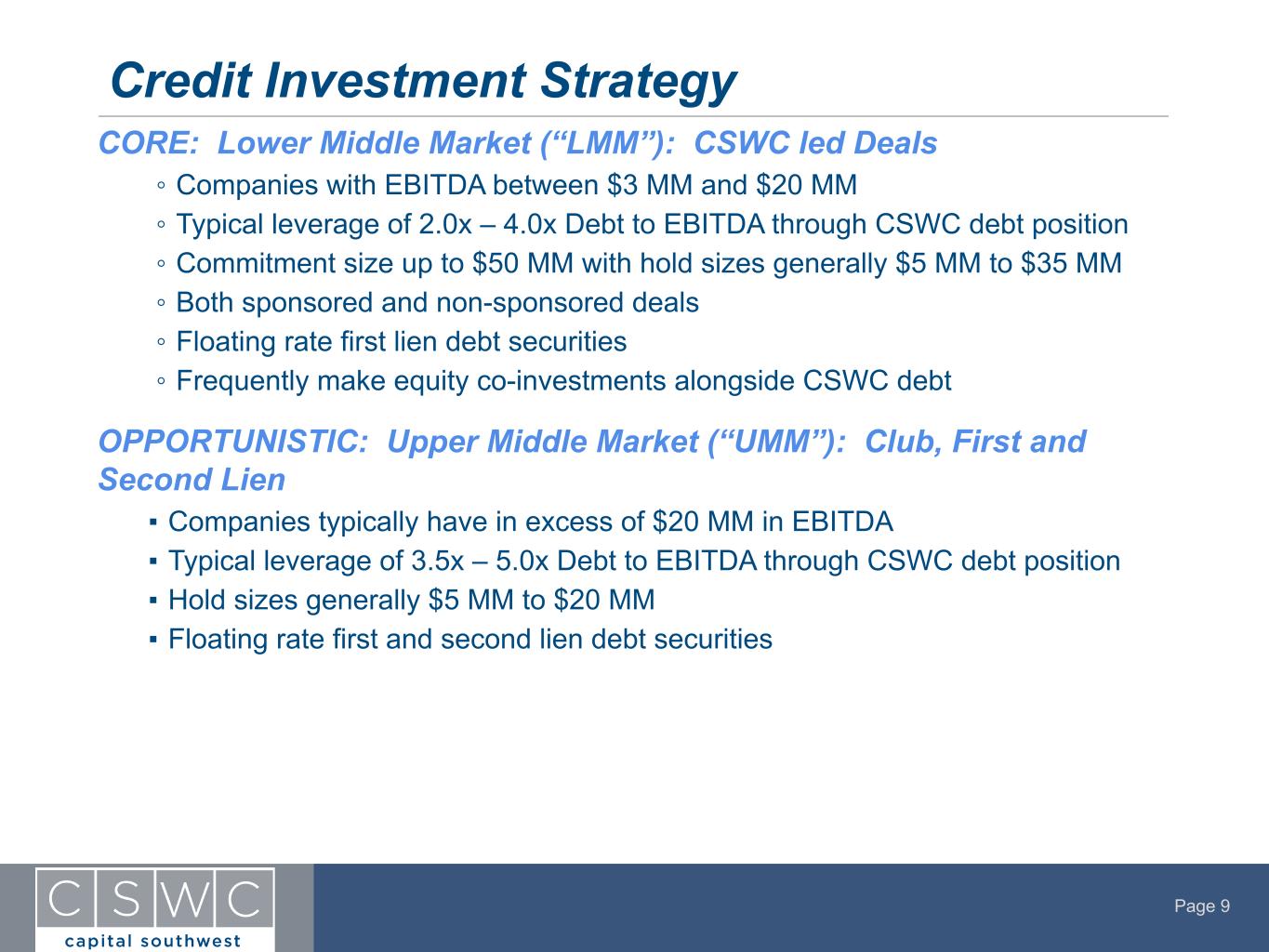 Page 8 History of Value Creation $17.68 $17.38 $18.63 $20.90 $22.71 $21.97 $24.90 $28.27 $30.06 $30.66 $31.36 $32.30 $17.68 $17.34 $17.80 $19.08 $18.62 $15.13 $16.01 $16.86 $16.37 $16.38 $16.46 $16.77 $0.26 $0.26 $1.16 $2.31 $2.71 $3.41 $3.66 $3.71 $3.77 $3.83 $0.04 $0.57 $1.56 $2.93 $4.53 $6.18 $8.00 $10.03 $10.57 $11.13 $11.70 Net Asset Value Per Share Cumulative Special/Supplemental Dividends Paid Per Share Cumulative Regular Dividends Paid Per Share 9/30/2015 3/31/2016 3/31/2017 3/31/2018 3/31/2019 3/31/2020 3/31/2021 3/31/2022 3/31/2023 6/30/2023 9/30/2023 12/31/2023 $0.00 $5.00 $10.00 $15.00 $20.00 $25.00 $30.00 $35.00 Total Value (Net Asset Value + Cumulative Dividends Paid) Increase from Credit Strategy of $14.62 per share through 12/31/2023