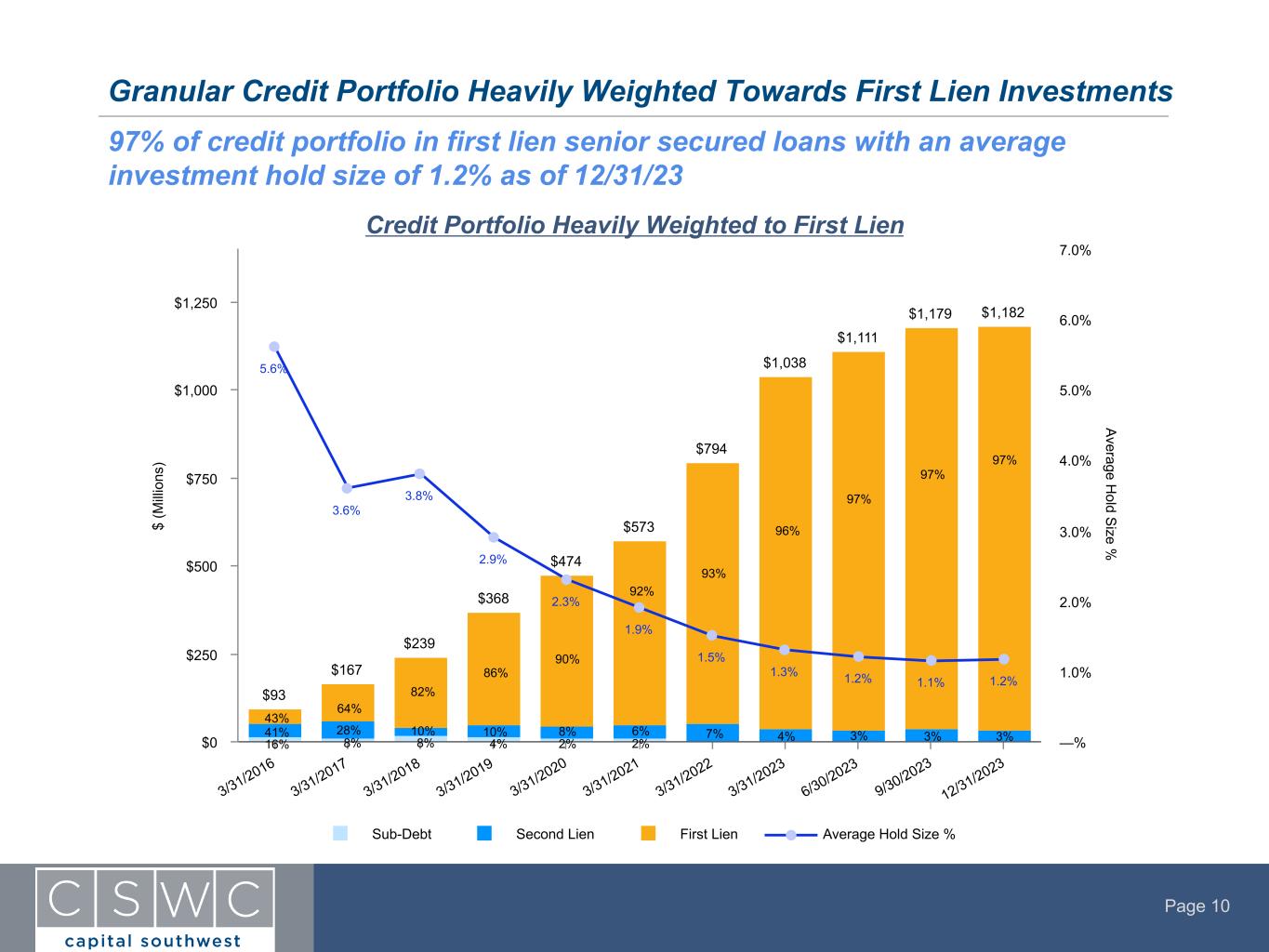 Page 9 CORE: Lower Middle Market (“LMM”): CSWC led Deals ◦ Companies with EBITDA between $3 MM and $20 MM ◦ Typical leverage of 2.0x – 4.0x Debt to EBITDA through CSWC debt position ◦ Commitment size up to $50 MM with hold sizes generally $5 MM to $35 MM ◦ Both sponsored and non-sponsored deals ◦ Floating rate first lien debt securities ◦ Frequently make equity co-investments alongside CSWC debt OPPORTUNISTIC: Upper Middle Market (“UMM”): Club, First and Second Lien ▪ Companies typically have in excess of $20 MM in EBITDA ▪ Typical leverage of 3.5x – 5.0x Debt to EBITDA through CSWC debt position ▪ Hold sizes generally $5 MM to $20 MM ▪ Floating rate first and second lien debt securities Credit Investment Strategy