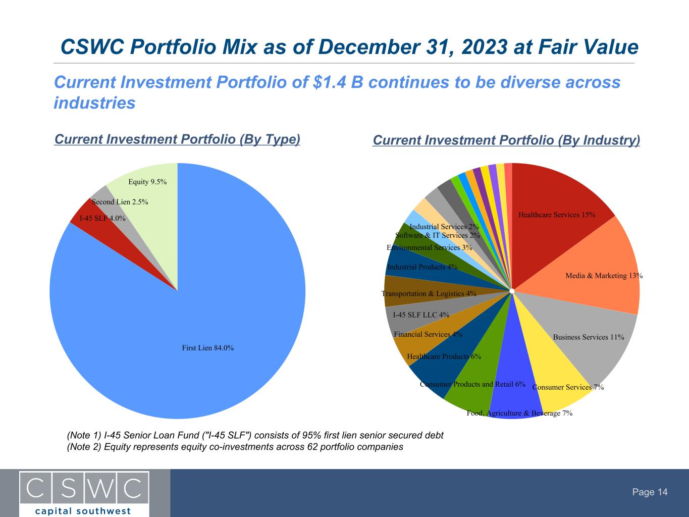 Page 13 CSWC Investment Portfolio Composition Note: All metrics above exclude the I-45 Senior Loan Fund (1) At December 31, 2023 and September 30, 2023, we had equity ownership in approximately 65% and 63%, respectively, of our investments (2) The weighted-average annual effective yields were computed using the effective interest rates during the quarter for all debt investments at cost as of December 31, 2023, including accretion of original issue discount but excluding fees payable upon repayment of the debt instruments (3) The weighted average annual effective yields on total investments were calculated by dividing total investment income, exclusive of non-recurring fees, by average total investments at fair value (4) Includes CSWC debt investments only. Weighted average EBITDA metric is calculated using investment cost basis weighting. For the quarters ended December 31, 2023 and September 30, 2023, eleven portfolio companies and ten portfolio companies, respectively, are excluded from this calculation due to a reported debt to adjusted EBITDA ratio that was not meaningful. (5) Includes CSWC debt investments only. Calculated as the amount of each portfolio company’s debt (including CSWC’s position and debt senior or pari passu to CSWC’s position, but excluding debt subordinated to CSWC’s position) in the capital structure divided by each portfolio company’s adjusted EBITDA. Weighted average leverage is calculated using investment cost basis weighting. For the quarters ended December 31, 2023 and September 30, 2023, eleven portfolio companies and ten portfolio companies, respectively, are excluded from this calculation due to a reported debt to adjusted EBITDA ratio that was not meaningful. Maintaining appropriate portfolio leverage while receiving attractive risk-adjusted returns Investment Portfolio - Statistics (in $000's) 9/30/2023 12/31/2023 Total CSWC Portfolio Total CSWC Portfolio Number of Portfolio Companies 94 95 Total Cost $1,280,155 $1,289,106 Total Fair Value $1,300,144 $1,310,837 Average Hold Size Debt Investments (at Fair Value) $13,553 $13,741 Average Hold Size Equity Investments (at Fair Value) $2,052 $2,082 % First Lien Investments (at Fair Value) 87.8% 87.5% % Second Lien Investments (at Fair Value) 2.8% 2.6% % Subordinated Debt Investments (at Fair Value) 0.1% 0.1% % Equity (at Fair Value) (1) 9.3% 9.8% Wtd. Avg. Yield on Debt Investments (2) 13.5% 13.5% Wtd. Avg. Yield on Total Investments (3) 13.0% 13.7% Wtd. Avg. EBITDA of Issuer ($MM's) (4) $20.0 $19.1 Wtd. Avg. Leverage through CSWC Security (5) 3.6x 3.6x
