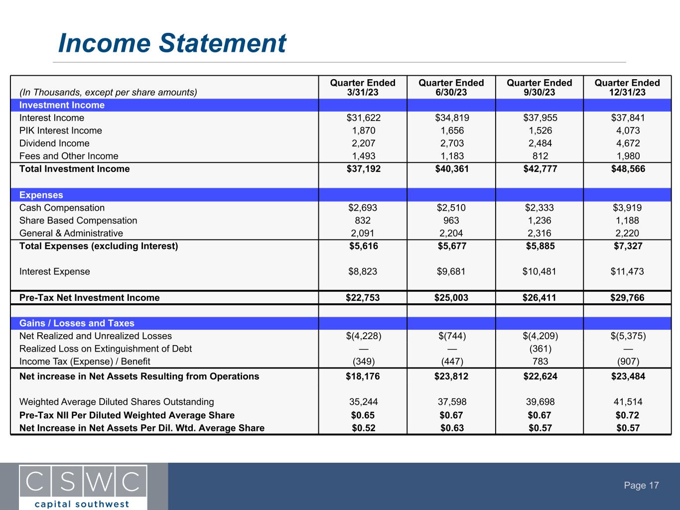 During the quarter ended December 31, 2023, Capital Southwest recorded total net realized and unrealized losses on investments of $5.4 million, compared to $4.2 million of total net realized and unrealized losses in the prior quarter. For the quarter ended December 31, 2023, this included net unrealized gains on I-45 SLF of $0.8 million, net realized and unrealized losses on equity investments of $0.6 million and net realized and unrealized losses on debt investments of $5.6 million. The net increase in net assets resulting from operations was $23.5 million for the quarter, compared to $22.6 million in the prior quarter.
