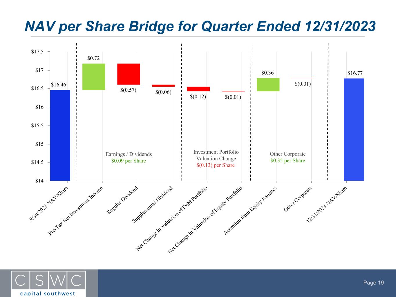 The Company’s NAV at December 31, 2023 was $16.77 per share, as compared to $16.46 at September 30, 2023. The increase in NAV per share from the prior quarter is primarily due to pre-tax net investment income in excess of dividends paid for the quarter, as well as the issuance of common stock at a premium to NAV per share through the Equity ATM Program (as described below), partially offset by net realized and unrealized losses on investments.