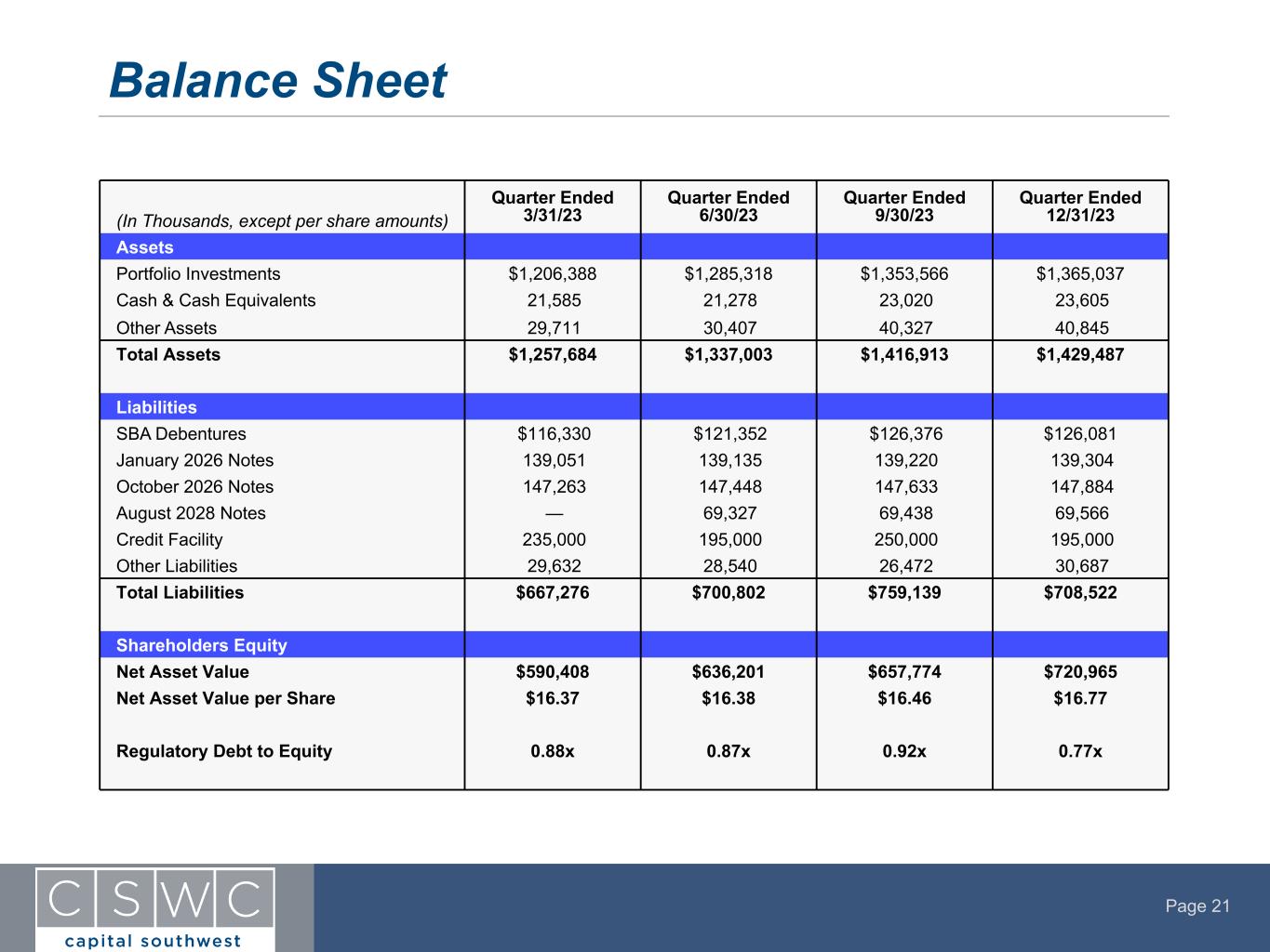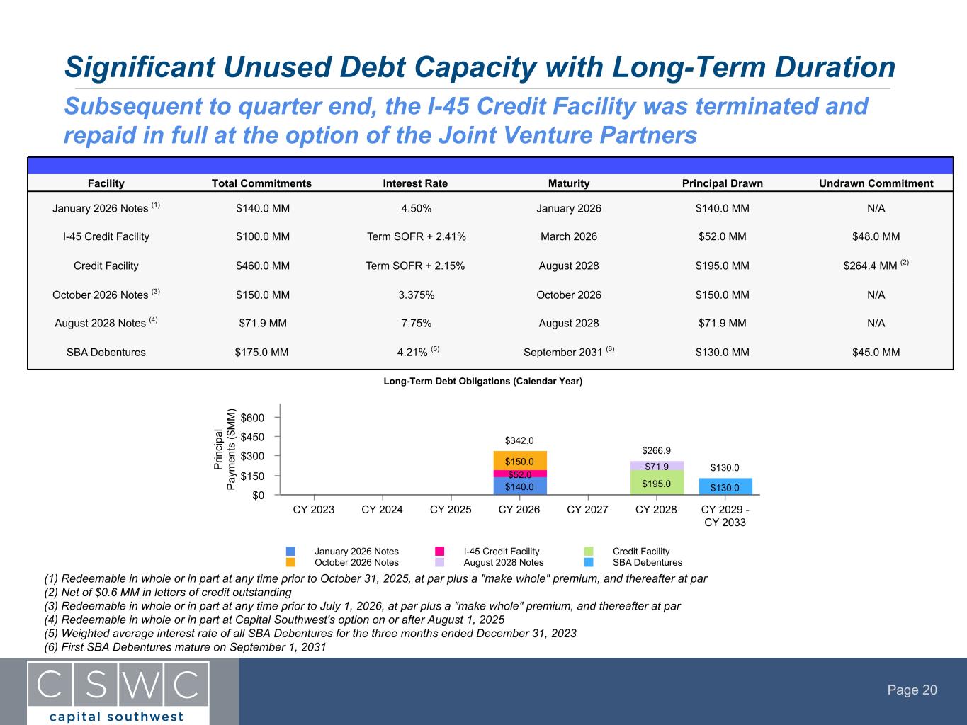 At December 31, 2023, Capital Southwest had approximately $23.6 million in unrestricted cash and money market balances, $195.0 million of total debt outstanding on the Credit Facility (as defined below), $139.3 million, net of unamortized debt issuance costs, of the 4.50% Notes due January 2026 outstanding, $147.9 million, net of unamortized debt issuance costs, of the 3.375% Notes due October 2026, $69.6 million, net of unamortized debt issuance costs, of the 7.75% Notes due August 2028 and $126.1 million, net of unamortized debt issuance costs, of SBA Debentures (as defined below) outstanding. As of December 31, 2023, Capital Southwest had $264.4 million in available borrowings under the Credit Facility. The regulatory debt to equity ratio at the end of the quarter was 0.77 to 1.
