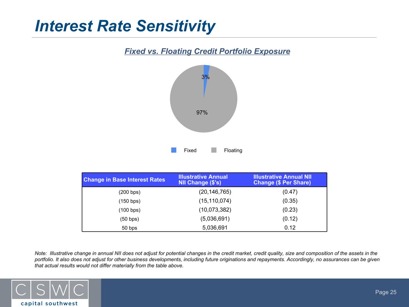 Page 25 Note: Illustrative change in annual NII does not adjust for potential changes in the credit market, credit quality, size and composition of the assets in the portfolio. It also does not adjust for other business developments, including future originations and repayments. Accordingly, no assurances can be given that actual results would not differ materially from the table above. Interest Rate Sensitivity Fixed vs. Floating Credit Portfolio Exposure Change in Base Interest Rates Illustrative Annual NII Change ($'s) Illustrative Annual NII Change ($ Per Share) (200 bps) (20,146,765) (0.47) (150 bps) (15,110,074) (0.35) (100 bps) (10,073,382) (0.23) (50 bps) (5,036,691) (0.12) 50 bps 5,036,691 0.12 3% 97% Fixed Floating