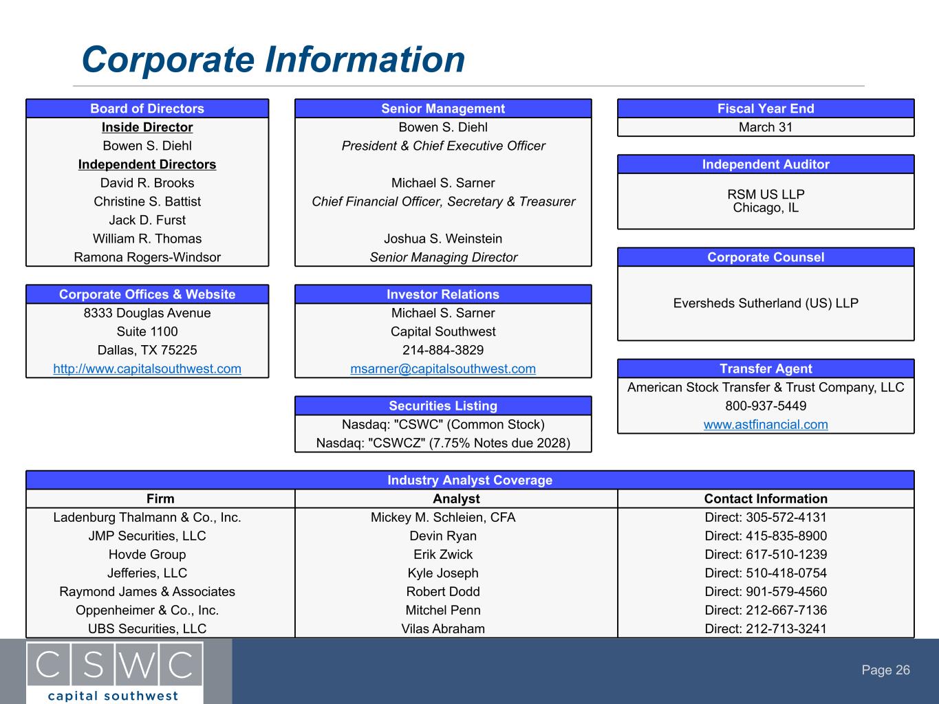 Page 26 Corporate Information Board of Directors Senior Management Fiscal Year End Inside Director Bowen S. Diehl March 31 Bowen S. Diehl President & Chief Executive Officer Independent Directors Independent Auditor David R. Brooks Michael S. Sarner RSM US LLP Chicago, ILChristine S. Battist Chief Financial Officer, Secretary & Treasurer Jack D. Furst William R. Thomas Joshua S. Weinstein Ramona Rogers-Windsor Senior Managing Director Corporate Counsel Eversheds Sutherland (US) LLP Corporate Offices & Website Investor Relations 8333 Douglas Avenue Michael S. Sarner Suite 1100 Capital Southwest Dallas, TX 75225 214-884-3829 http://www.capitalsouthwest.com msarner@capitalsouthwest.com Transfer Agent American Stock Transfer & Trust Company, LLC Securities Listing 800-937-5449 Nasdaq: "CSWC" (Common Stock) www.astfinancial.com Nasdaq: "CSWCZ" (7.75% Notes due 2028) Industry Analyst Coverage Firm Analyst Contact Information Ladenburg Thalmann & Co., Inc. Mickey M. Schleien, CFA Direct: 305-572-4131 JMP Securities, LLC Devin Ryan Direct: 415-835-8900 Hovde Group Erik Zwick Direct: 617-510-1239 Jefferies, LLC Kyle Joseph Direct: 510-418-0754 Raymond James & Associates Robert Dodd Direct: 901-579-4560 Oppenheimer & Co., Inc. Mitchel Penn Direct: 212-667-7136 UBS Securities, LLC Vilas Abraham Direct: 212-713-3241