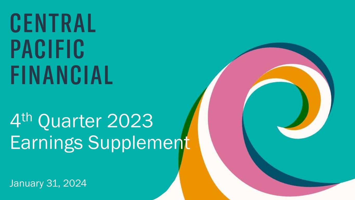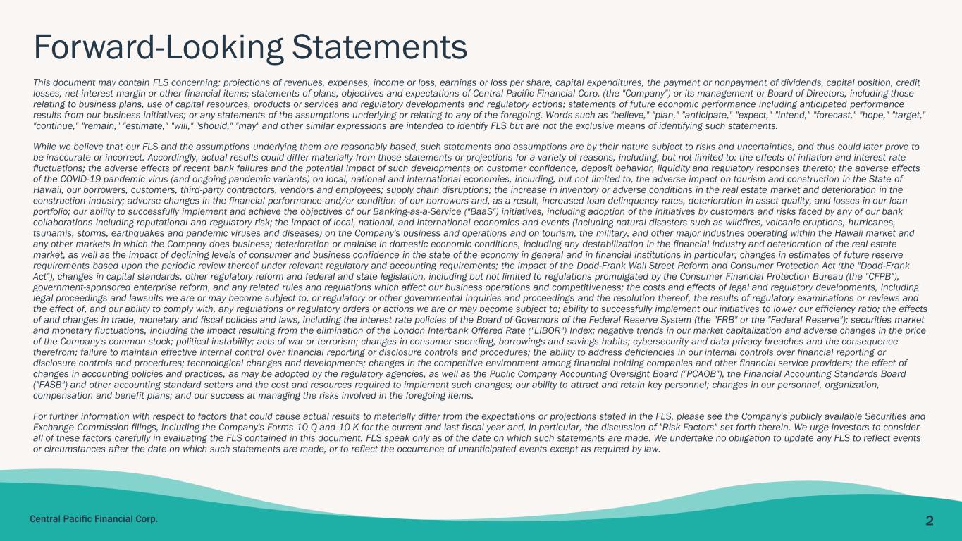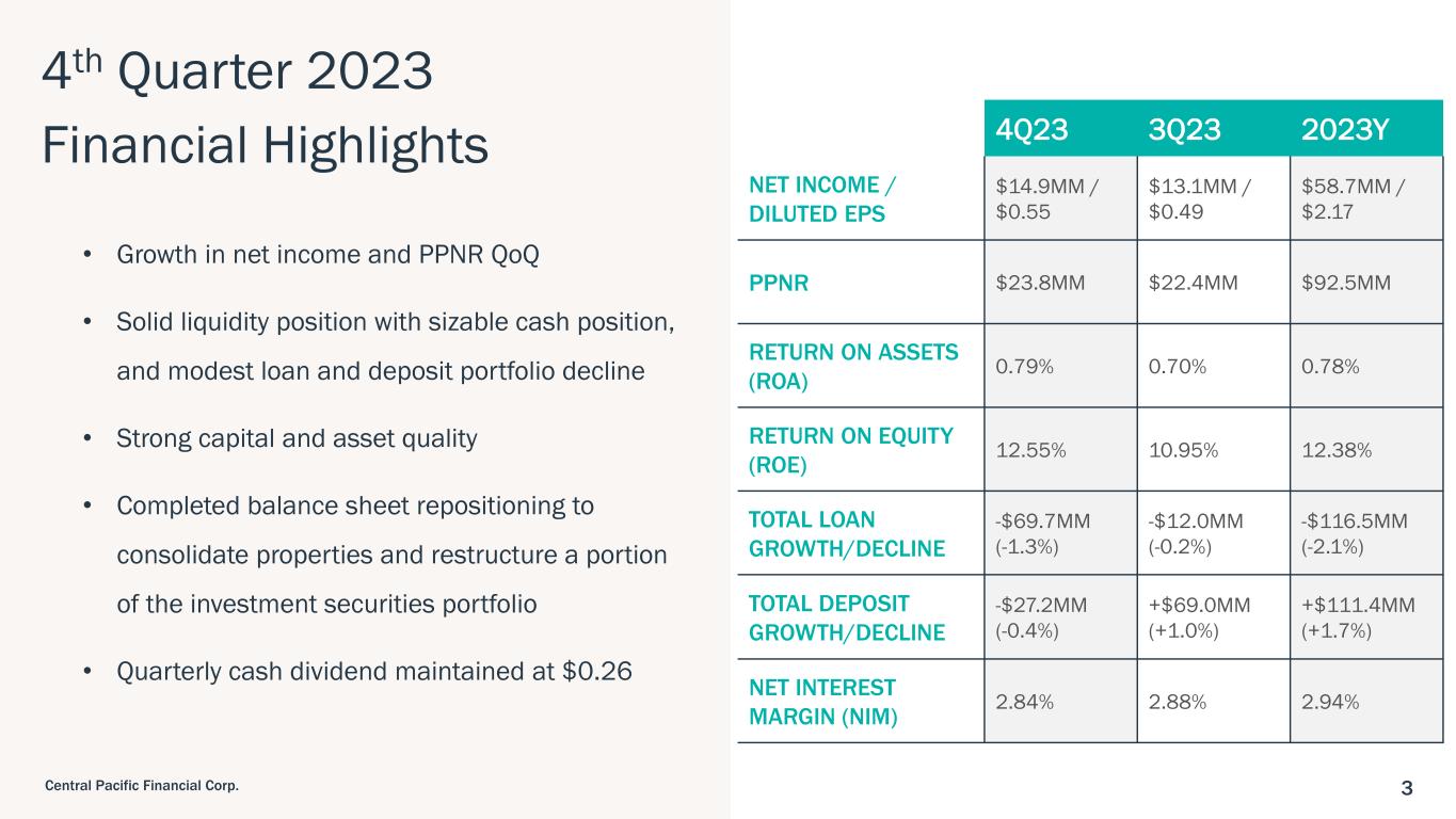 2Central Pacific Financial Corp. Forward-Looking Statements This document may contain FLS concerning: projections of revenues, expenses, income or loss, earnings or loss per share, capital expenditures, the payment or nonpayment of dividends, capital position, credit losses, net interest margin or other financial items; statements of plans, objectives and expectations of Central Pacific Financial Corp. (the "Company") or its management or Board of Directors, including those relating to business plans, use of capital resources, products or services and regulatory developments and regulatory actions; statements of future economic performance including anticipated performance results from our business initiatives; or any statements of the assumptions underlying or relating to any of the foregoing. Words such as "believe," "plan," "anticipate," "expect," "intend," "forecast," "hope," "target," "continue," "remain," "estimate," "will," "should," "may" and other similar expressions are intended to identify FLS but are not the exclusive means of identifying such statements. While we believe that our FLS and the assumptions underlying them are reasonably based, such statements and assumptions are by their nature subject to risks and uncertainties, and thus could later prove to be inaccurate or incorrect. Accordingly, actual results could differ materially from those statements or projections for a variety of reasons, including, but not limited to: the effects of inflation and interest rate fluctuations; the adverse effects of recent bank failures and the potential impact of such developments on customer confidence, deposit behavior, liquidity and regulatory responses thereto; the adverse effects of the COVID-19 pandemic virus (and ongoing pandemic variants) on local, national and international economies, including, but not limited to, the adverse impact on tourism and construction in the State of Hawaii, our borrowers, customers, third-party contractors, vendors and employees; supply chain disruptions; the increase in inventory or adverse conditions in the real estate market and deterioration in the construction industry; adverse changes in the financial performance and/or condition of our borrowers and, as a result, increased loan delinquency rates, deterioration in asset quality, and losses in our loan portfolio; our ability to successfully implement and achieve the objectives of our Banking-as-a-Service ("BaaS") initiatives, including adoption of the initiatives by customers and risks faced by any of our bank collaborations including reputational and regulatory risk; the impact of local, national, and international economies and events (including natural disasters such as wildfires, volcanic eruptions, hurricanes, tsunamis, storms, earthquakes and pandemic viruses and diseases) on the Company's business and operations and on tourism, the military, and other major industries operating within the Hawaii market and any other markets in which the Company does business; deterioration or malaise in domestic economic conditions, including any destabilization in the financial industry and deterioration of the real estate market, as well as the impact of declining levels of consumer and business confidence in the state of the economy in general and in financial institutions in particular; changes in estimates of future reserve requirements based upon the periodic review thereof under relevant regulatory and accounting requirements; the impact of the Dodd-Frank Wall Street Reform and Consumer Protection Act (the "Dodd-Frank Act"), changes in capital standards, other regulatory reform and federal and state legislation, including but not limited to regulations promulgated by the Consumer Financial Protection Bureau (the "CFPB"), government-sponsored enterprise reform, and any related rules and regulations which affect our business operations and competitiveness; the costs and effects of legal and regulatory developments, including legal proceedings and lawsuits we are or may become subject to, or regulatory or other governmental inquiries and proceedings and the resolution thereof, the results of regulatory examinations or reviews and the effect of, and our ability to comply with, any regulations or regulatory orders or actions we are or may become subject to; ability to successfully implement our initiatives to lower our efficiency ratio; the effects of and changes in trade, monetary and fiscal policies and laws, including the interest rate policies of the Board of Governors of the Federal Reserve System (the "FRB" or the "Federal Reserve"); securities market and monetary fluctuations, including the impact resulting from the elimination of the London Interbank Offered Rate ("LIBOR") Index; negative trends in our market capitalization and adverse changes in the price of the Company's common stock; political instability; acts of war or terrorism; changes in consumer spending, borrowings and savings habits; cybersecurity and data privacy breaches and the consequence therefrom; failure to maintain effective internal control over financial reporting or disclosure controls and procedures; the ability to address deficiencies in our internal controls over financial reporting or disclosure controls and procedures; technological changes and developments; changes in the competitive environment among financial holding companies and other financial service providers; the effect of changes in accounting policies and practices, as may be adopted by the regulatory agencies, as well as the Public Company Accounting Oversight Board ("PCAOB"), the Financial Accounting Standards Board ("FASB") and other accounting standard setters and the cost and resources required to implement such changes; our ability to attract and retain key personnel; changes in our personnel, organization, compensation and benefit plans; and our success at managing the risks involved in the foregoing items. For further information with respect to fa