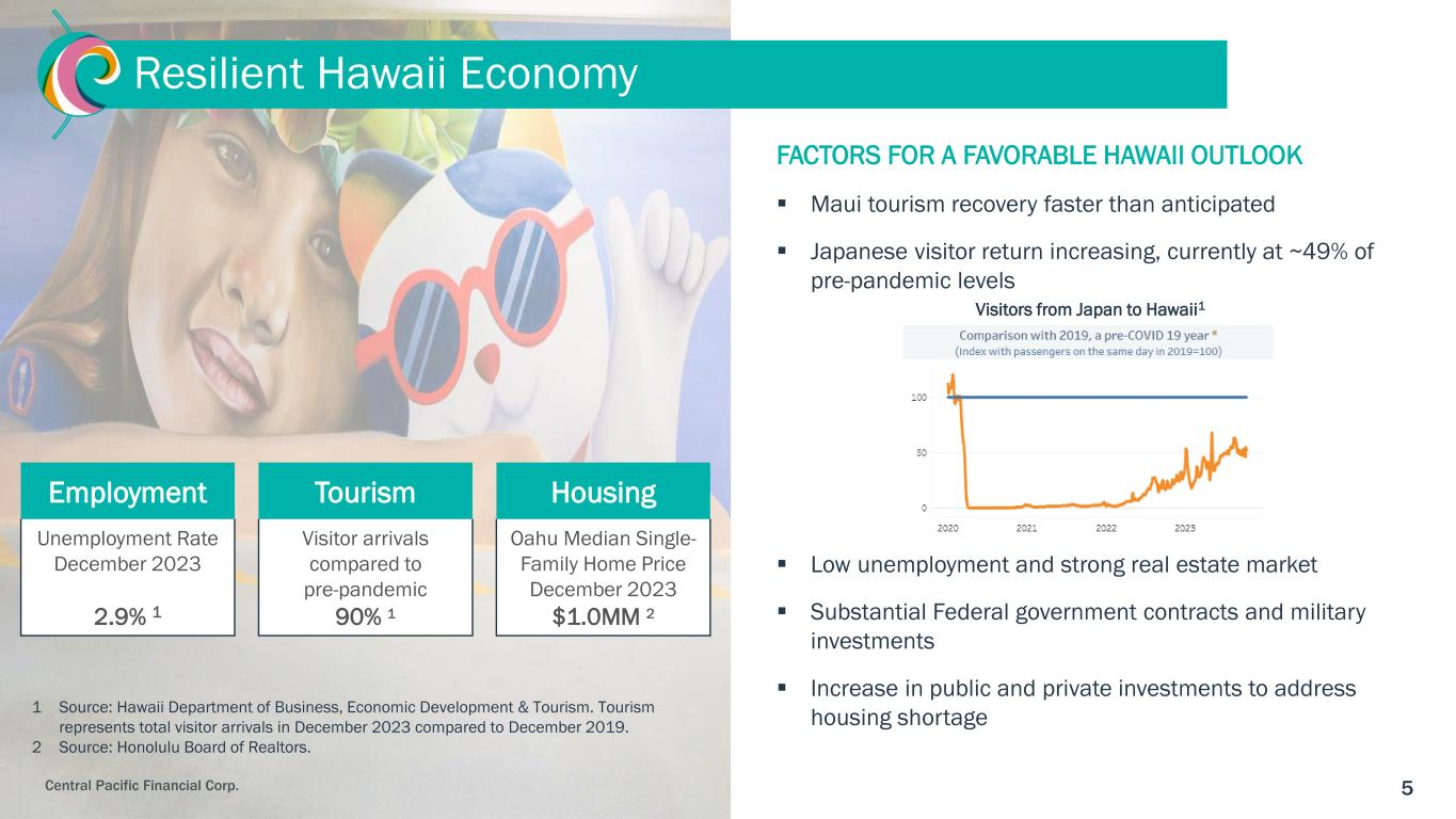 4Central Pacific Financial Corp. 4Q Balance Sheet Repositioning Summary2 • Completed investment portfolio restructuring which is expected to add $0.7 million to annual pre-tax income • Sold available-for-sale debt securities with a book value of $30.0 million, weighted average yield of 3.3%, weighted average duration of 3.4 years, and recognized a loss of $1.9 million. • Purchased $28.3 million in debt securities with a weighted average yield of 5.7% and weighted average duration of 2.5 years. • Estimated earn-back period of approximately 2.8 years. • Terminated a lease for a branch that was consolidated, and incurred a one-time expense of $2.3 million • Expected future annual expense savings of approximately $0.7 million. • Consolidated office space by selling an office real estate property and realized a net gain on sale of $5.1 million • Expected future annual expense savings of approximately $0.6 million. 1 Included in Other Operating Income in 4Q23 2 Included in Other Operating Expense in 4Q23 $ Millions One-time Impact Annual Go-Forward Impact Investment Securities Restructuring (1.9) 1 0.7 Branch Lease Termination (2.3) 2 0.7 Sale and Consolidation of Office Real Estate 5.1 1 0.6 Total Income Statement Impact 0.9 2.0